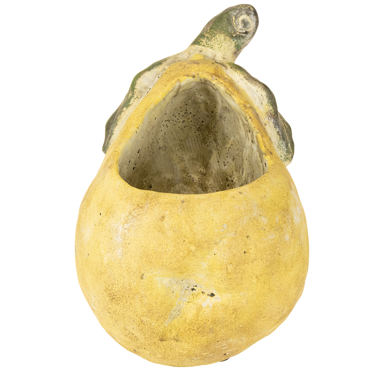 A dekoratív körte oldalt fekve látható, tetején tágas nyílás található, amely mindenféle virágdíszítéssel megtölthető. Készítsen rusztikus dekorációs elrendezéseket késő nyárra vagy őszre a díszítő kerámiákkal.