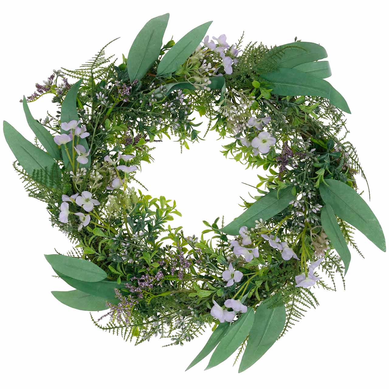 Termék neve: Dekoratív koszorú eukaliptusz, páfrány, virágok Műkoszorú