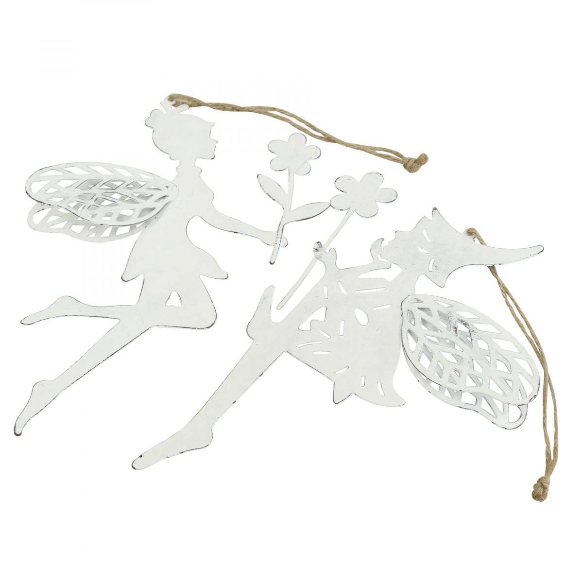 A manópár virágfehér sziluettként ül egymással szemben: hegyes tündesapkát visel, haját összetűzte. A fémdísz mindkét figurája virágot hozott. Talán egy romantikus szerelmi jelenetnek lehetsz szemtanúja a két manó között... És feltűnt már a dekoratív figurák filigrán lyukasztott, háromdimenziós szárnyai?