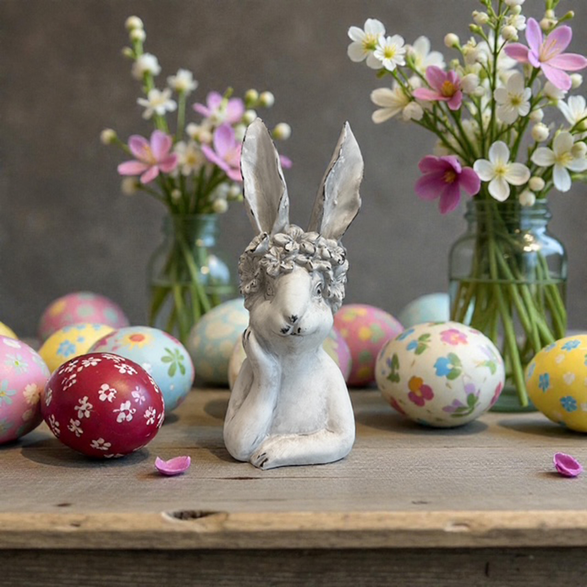 Dekoratív nyulacska lenyűgözi a visszafogott elegancia és a finom részletek harmonikus összjátékával. A kifejező póz a támasztó kezével és a játékos virágkoszorú a fején egyedi személyiséget kölcsönöz ennek a figurának. A kellemes szürke szín sokoldalúvá teszi, míg a kiváló minőségű kerámia anyag stabilitást és tartósságot biztosít. Beltéri és fedett kültéri területekre egyaránt alkalmas.