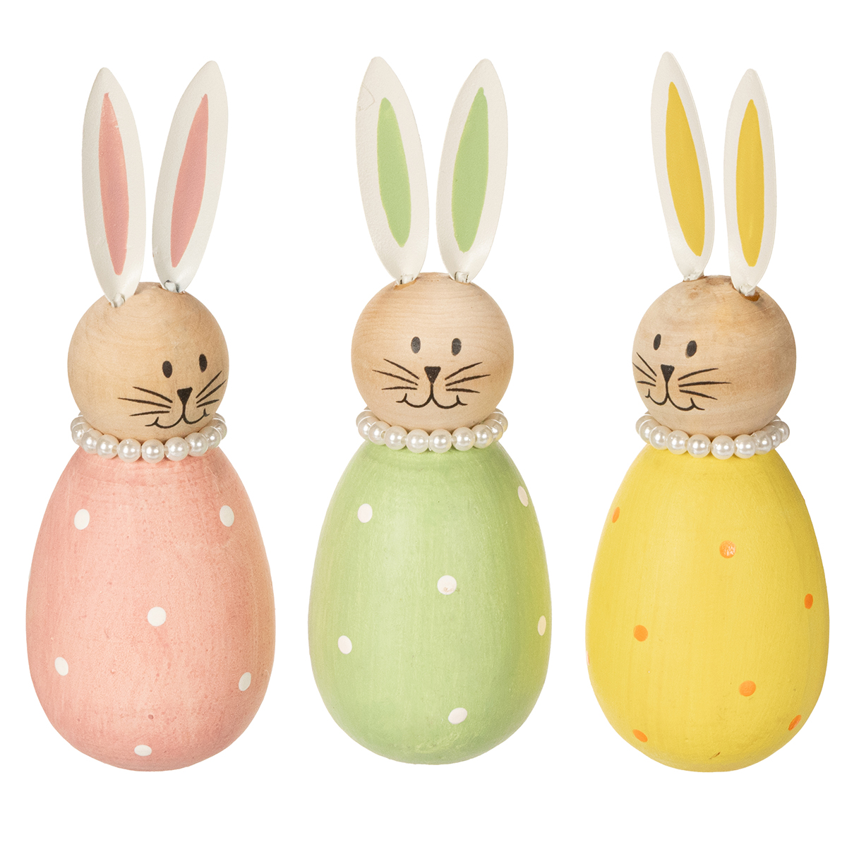 Termék neve: Dekoratív nyúlfigurák pasztell fából, húsvéti nyuszik gyöngy nyaklánccal, 14,5 x 5 cm, 3 darab