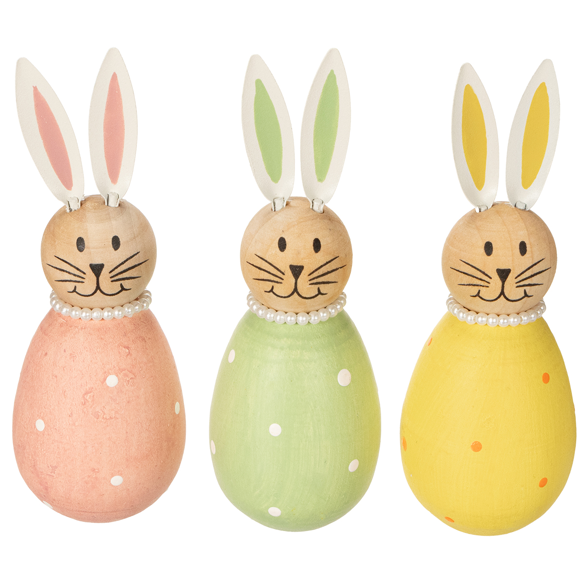 Mi lehetne jobb annál, mint bájos dekorációval köszönteni a tavaszt? Ezek a díszes, tojás alakú nyuszi figurák nemcsak mosolyt csalnak mindenki arcára, hanem vidám tavaszi hangulattal töltik meg az életterét. Akár az ablakpárkányon, a húsvéti asztalon vagy egy polcon helyezkednek el, ezek a szeretettel készített díszes figurák biztosan mindenki tekintetét magukra vonják. Finom pasztell rózsaszín, sárga és zöld árnyalataikkal, valamint kézzel festett részleteikkel meleg és hívogató hangulatot kölcsönöznek otthonának. A finom fém fülek, a tojásokon lévő finom pöttyök és a nyakukban lévő kecses gyöngy nyakláncok – ezek az apró részletek teszik a figurákat igazán különlegessé. Szeretnél egy csipetnyi tavaszi könnyedséget vinni a szobáidba, vagy feldobni a húsvéti dekorációdat? Akkor ezek a színes fa nyuszik a tökéletes választás!