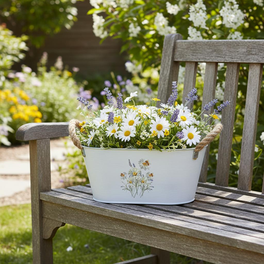 Az ovális fém dísztálon fehér százszorszépek és lila levendula virágzik. Méhek látogatják a virágokat. Két juta fogantyú művészien teszi teljessé a természetes képet a fehér fémtálon.