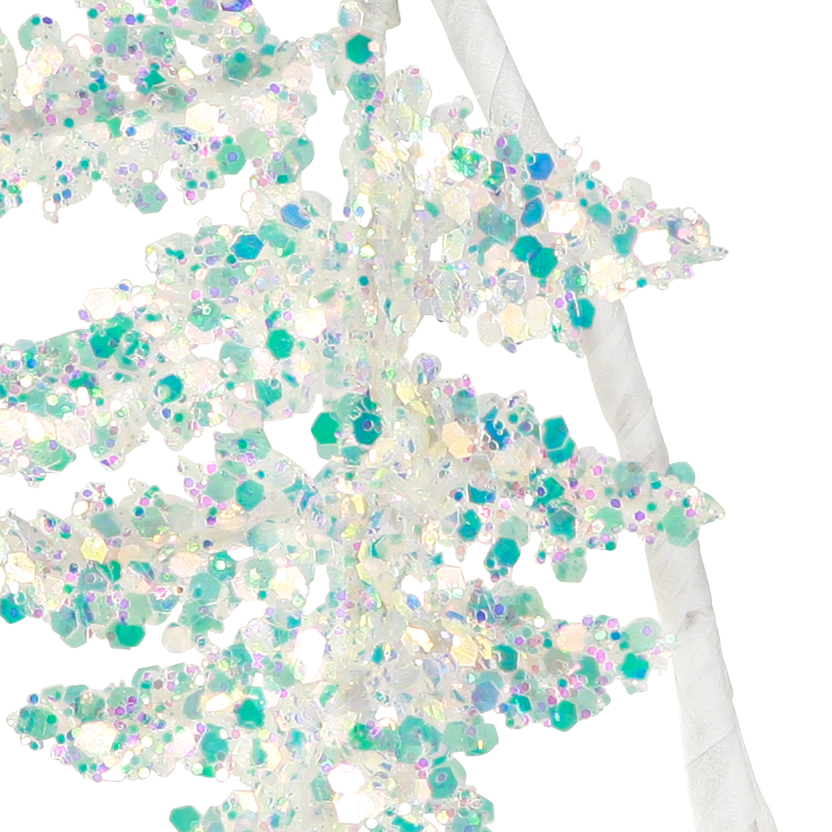 Ez a mesterséges páfrány lenyűgöz finoman kidolgozott leveleivel, amelyeket kék és ezüst flitterekkel díszítenek, és úgy néznek ki, mintha fagy borította volna. A szál fehér papírba van csomagolva, így úgy néz ki, mintha frissen hó borította volna. A téli dekoráció egy hajlékony csákányban végződik, amelyet könnyedén meghajlítva felakaszthatod a páfrányt.