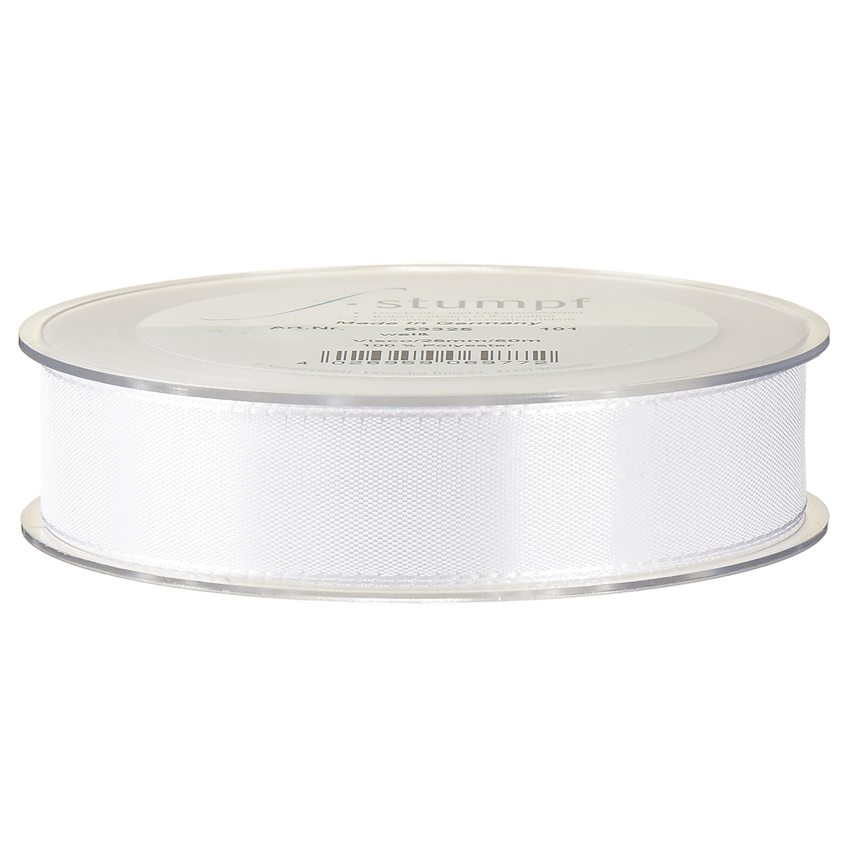 A fehér poliészter díszszalag egy műanyag orsóra van feltekerve, amely könnyen felakasztható a könnyű kezelés érdekében. Körülbelül 25 milliméter szélességével és körülbelül 50 méter hosszúságával.