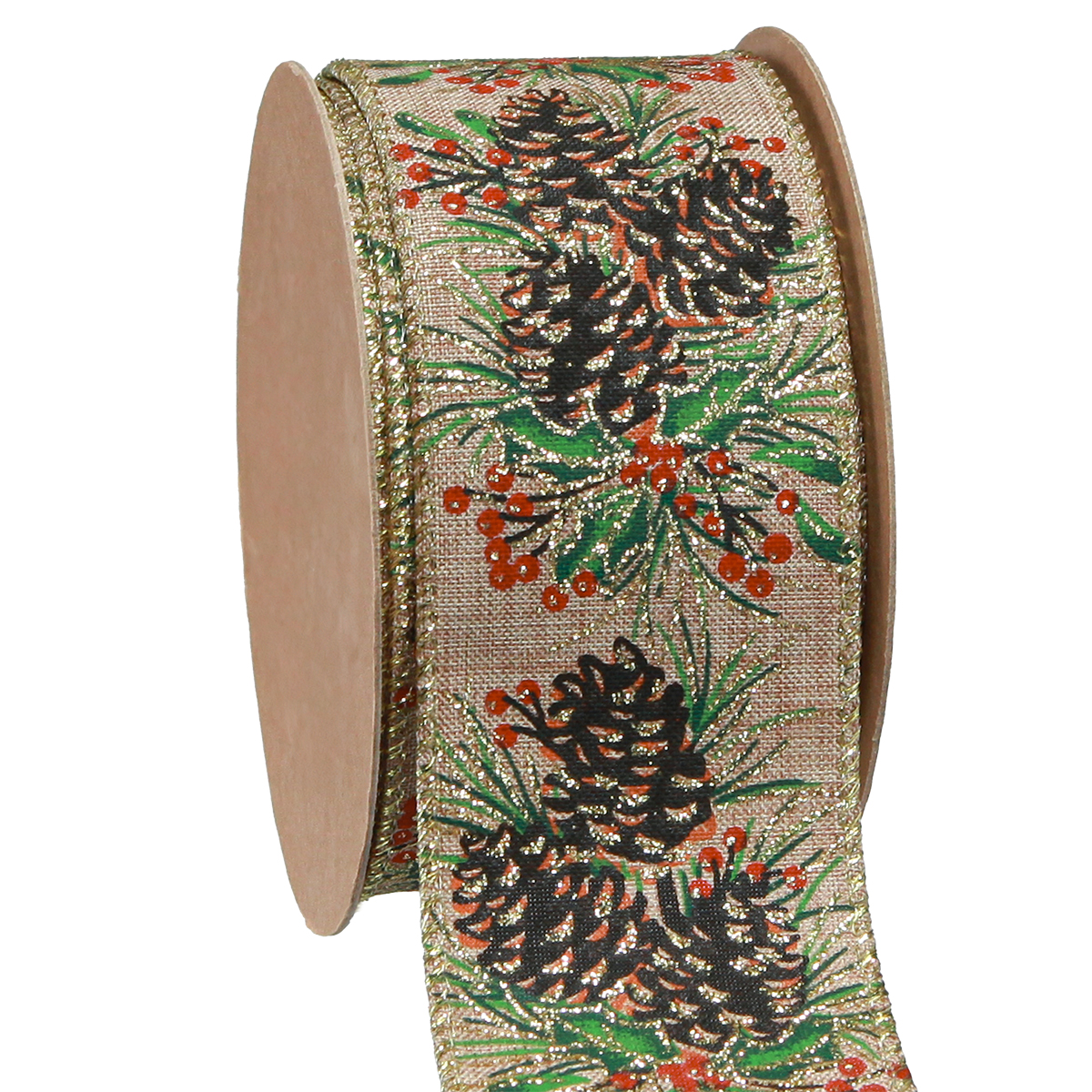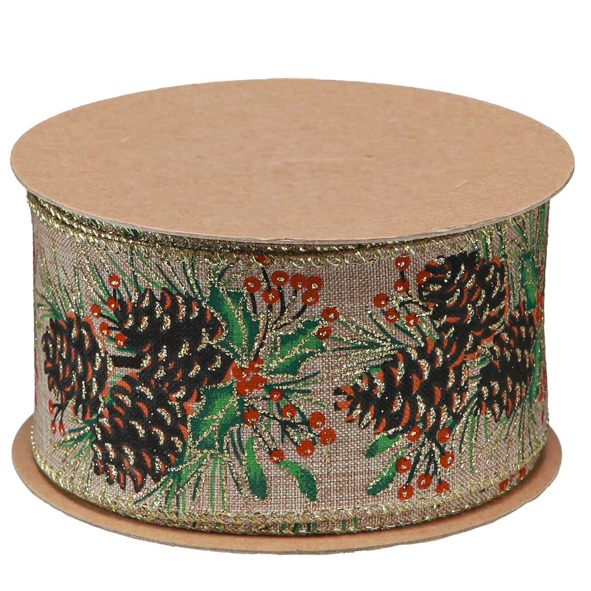 Dekoratív szalag karácsonyi kúpok széles ajándék szalag natúr 60mm 10m