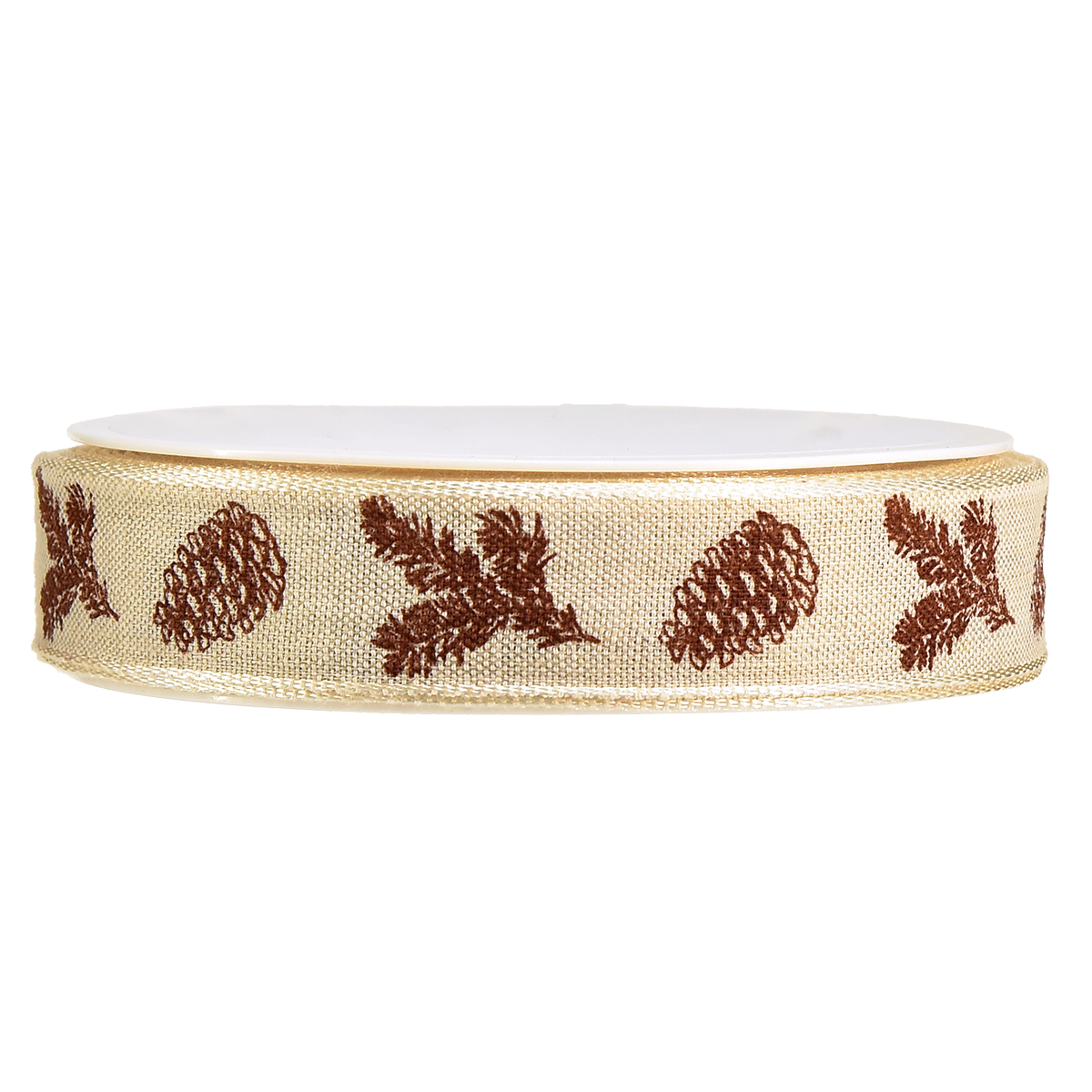 Télen adjon természetes és ünnepi hangulatot ajándékainak és dekorációinak kúpos szalagunkkal. Ez a krémes és barna színű, stilizált fenyőtoboz motívumokkal díszített szalag ideális választás mindazok számára, akik a meleg és rusztikus karácsonyi hangulatot kedvelik. Drótszegélyének köszönhetően az ajándék szalag könnyen formázható hurkokká, amelyek sokáig megőrzik formájukat.
