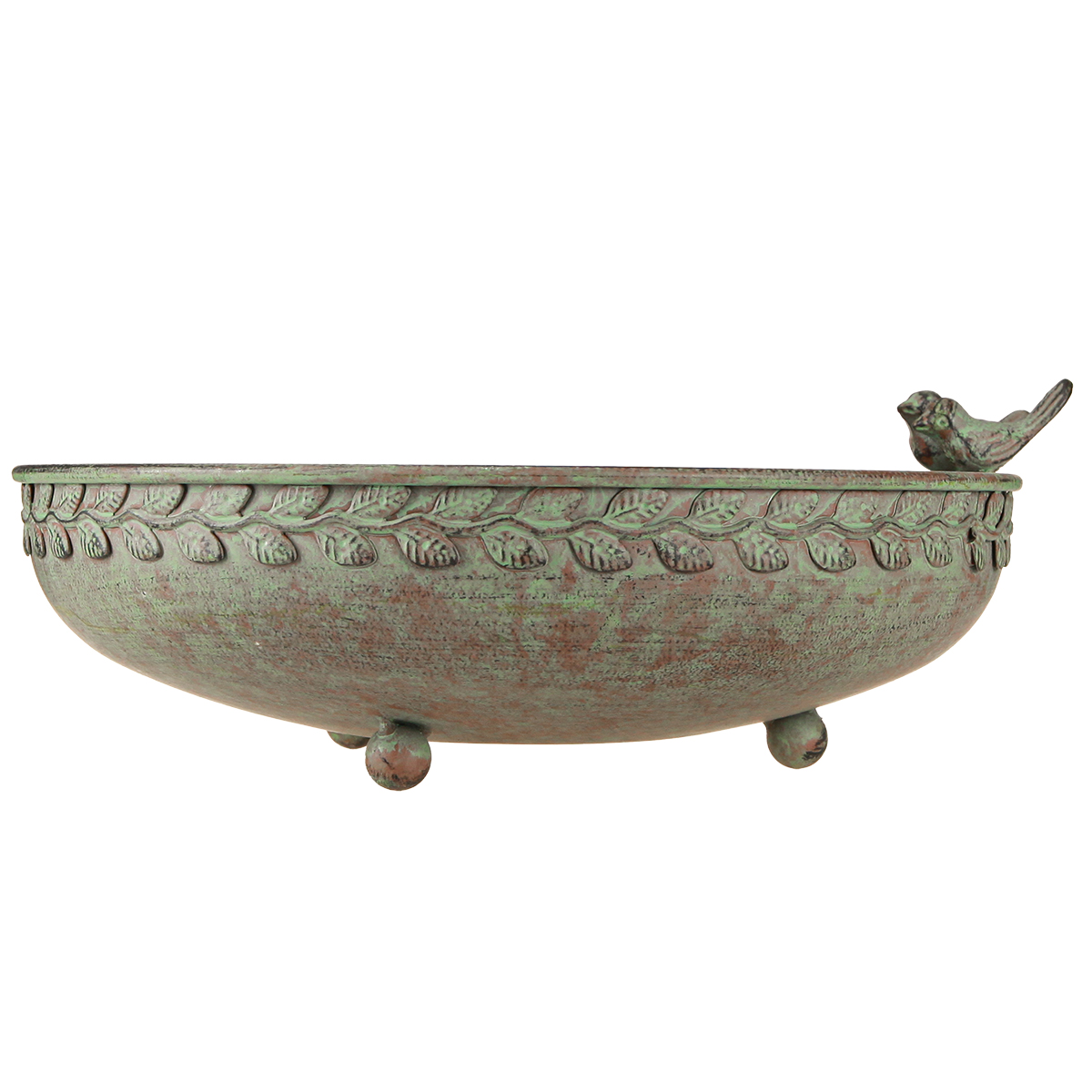 Két kis madár ül a fém dísztálon. A fémtál peremén szoborszerűen ábrázolt levélinda kanyarog. Idilli megjelenés antik kivitelben!A zöld és barna dísztál oxidáltnak tűnik, ezért nagyon régi. A három kis kerek láb is fokozza a fémdísz antik varázsát.