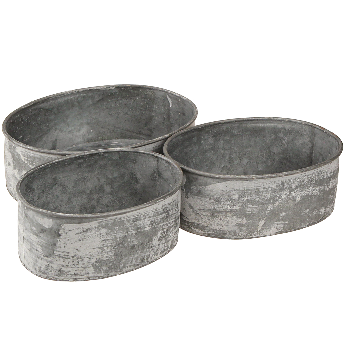 Az időtlen szürke és fehér színben mosott három tál klasszikus és vintage stílusú elrendezéshez egyaránt használható. A fém héjak elegáns kialakításúak, lekerekített éllel.