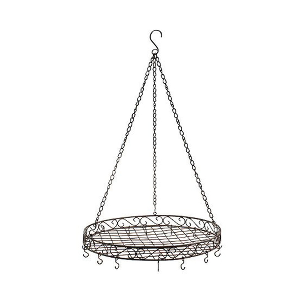 Elegáns vidéki stílusban szeretné berendezni lakását, és még mindig szüksége van egy nagyszerű dekorációs ötletre a mennyezethez? Akkor ez a dekoratív tálca pontosan a megfelelő választás! A tálca alja egy rácsos hálóból áll, amely egy kerek fémgyűrűhöz van rögzítve, klasszikus fürtökkel. A gyűrűre összesen 12 kis kampó van rögzítve, amelyekre felakaszthatunk például egy függő növényt, egy fényláncot, edényt, kést, fakanalat és egy hagymazsákot.