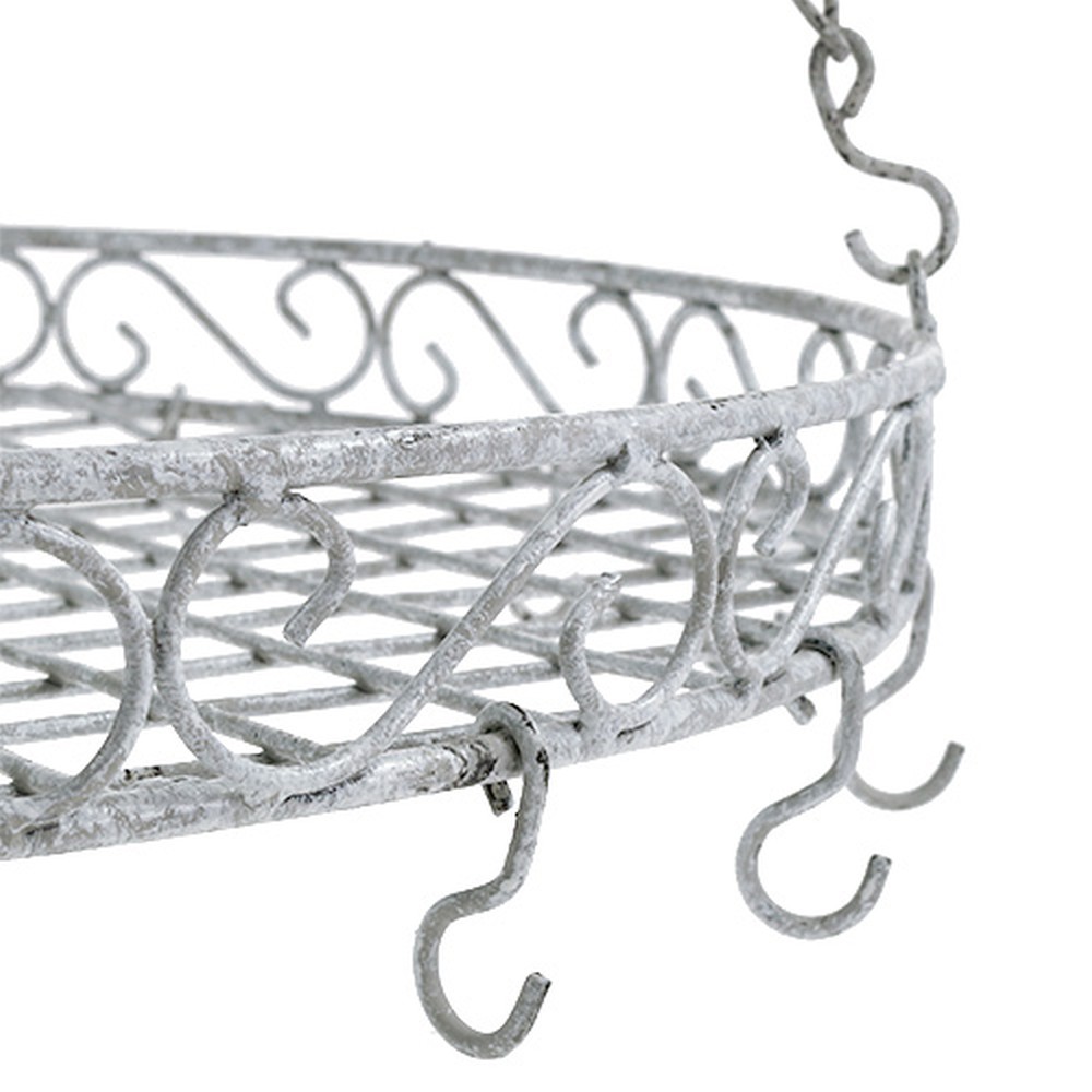 Ezzel a szürke, kampós dekoratív tálcával a divatos vidéki ház stílusát viszi be otthonába, és egy kifinomult univerzális készüléket is kap, amelyet tetszés szerint állíthat a rivaldafénybe. A kerek fémtálca nagyméretű hálóból készült alappal és díszes díszekkel díszített éllel rendelkezik. A tálca egy szabálytalanul felvitt, szürkésfehér lakktól kapja az utolsó simítást, a fekete területek mesterséges kopáshatást keltenek. Ezért nagyon különleges szemet gyönyörködtető a konyhába, nappaliba, teraszra vagy akár vendégszobába.