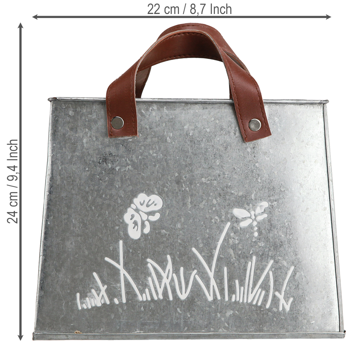 Ezüst színű dekoratív fémtáskáink rendkívüli módon ötvözik a funkcionalitást és a dizájnt. Ezek a virágtartók ideálisak lakberendezőknek, kreatív elméknek és mindenkinek, aki egy csipetnyi eleganciát szeretne otthonába varázsolni. Mindkét oldalán fehér pillangó- és fűmotívummal, valamint a barna műbőr fogantyúkkal egy olyan terméket kapsz, amely növénycserépnek és erkély vagy asztal díszítőelemének egyaránt alkalmas. Ez a dekoratív növényi táska kiemeli a rusztikus bájt, és gyönyörűen párosul más vintage dekorációval. Varázsolja otthonát személyessé ezekkel a rendkívüli fém cserepekkel, amelyek lenyűgöznek egyszerű, időtlen eleganciájukkal.