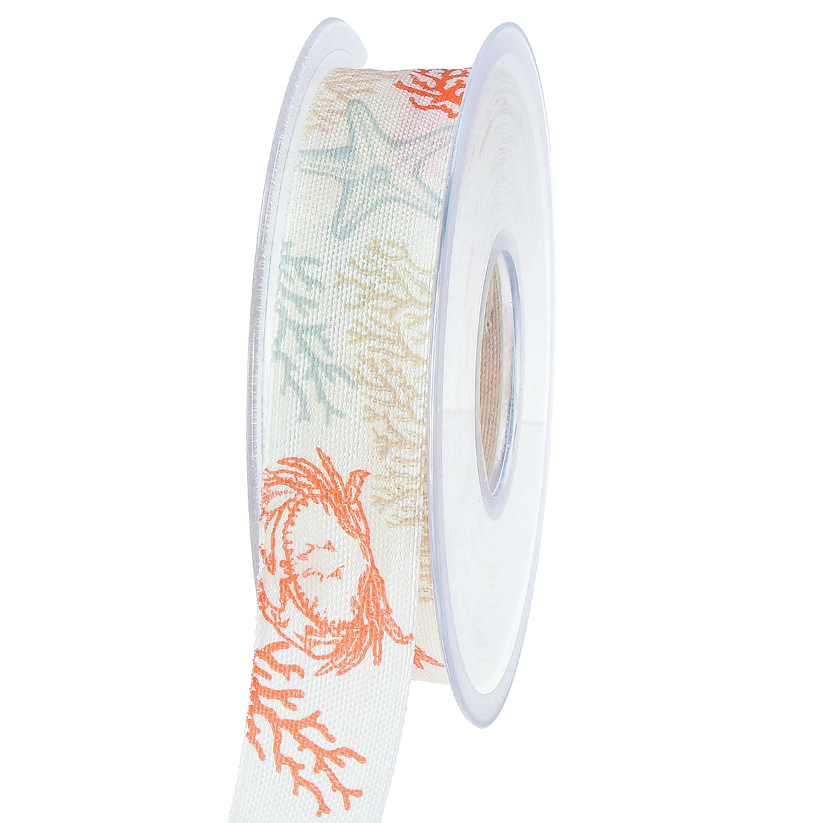 A krémszínű ajándékszalag tökéletesen harmonizál minden kagylóval, uszadékfával és tengeri homokkal. A narancssárga és világoskék színekben tervezett korallminta élénk, aktuális színeket hoz, amelyeket más tengeri dekorációkkal is kiemelhetsz.
