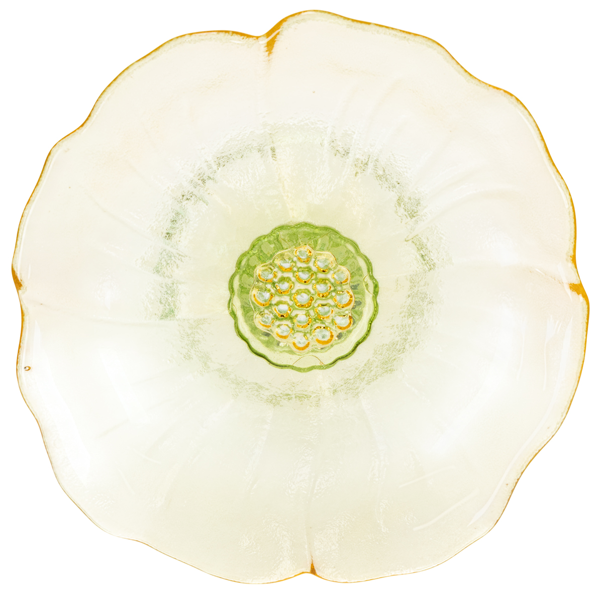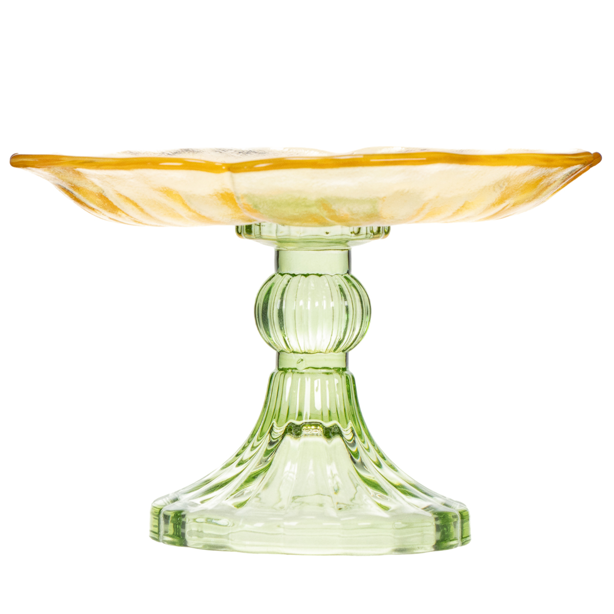 Ez a gyönyörű, ünnepi, díszes üvegtányér talpas talppal igazi tekinteteket vonz finom virágmintájával. A zöld, átlátszó üvegtalap elegánsan kiemeli a lágy sárga virágokat, és könnyed, légies érzetet kölcsönöz a tányérnak. Használd finoman becsomagolt édességek, kis sütemények vagy péksütemények stílusos bemutatására. Időtlen dizájnjának köszönhetően modern és rusztikus környezetbe egyaránt illik. Ideális különleges alkalmakra, például esküvőkre, húsvétra vagy születésnapokra – vagy egyszerűen csak a mindennapi asztalterítés fénypontjaként.
