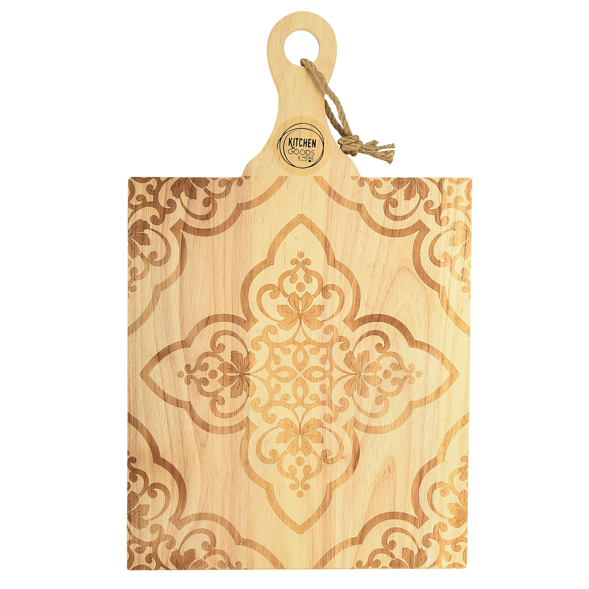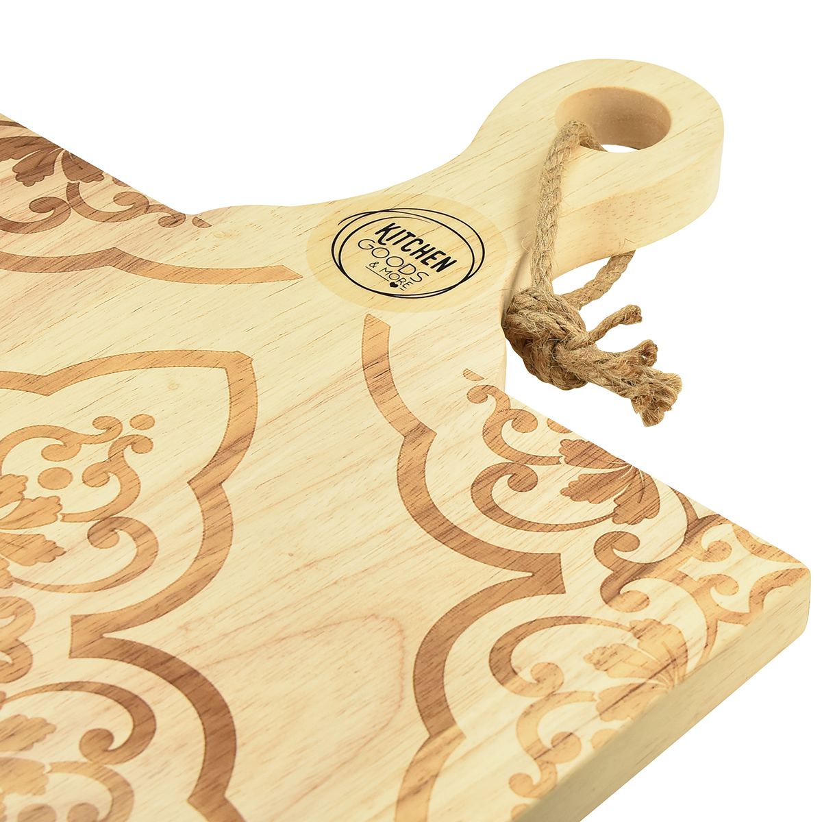 A virágos, nagyon klasszikus motívum diszkréten van beleégetve a világos fába, és világosbarnában vonzónak tűnik. A fa tábla fali dekorációként a fogantyúra akasztható. A vágódeszka dekorációra és hideg ételek készítésére alkalmas, mivel a természetes mangófát nem kezelték.