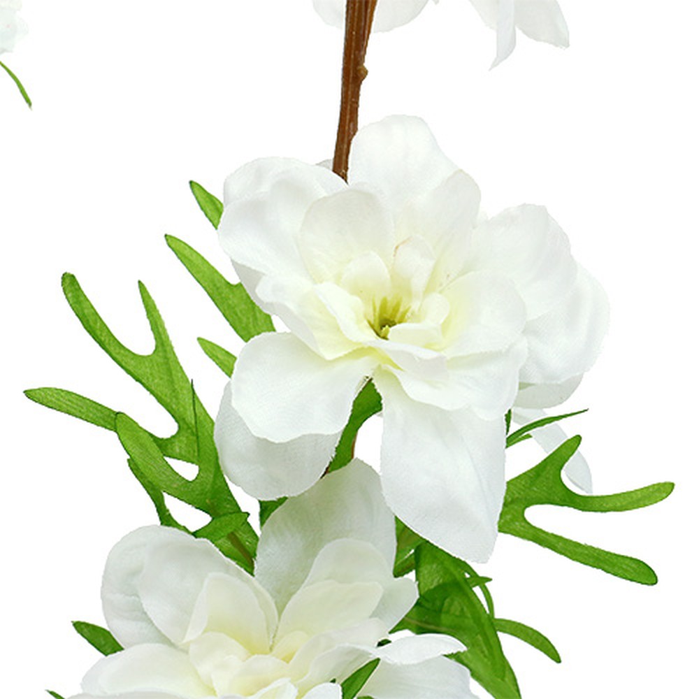 A fehér mesterséges delphinium körülbelül 95 centiméter hosszú, és a virágok különböző átmérőjűek, 4 és 6 centiméter között. A stabilitás érdekében a virágzó dísznövény magjában egy fémhuzal található, amely szintén könnyen hajlítható, így a növényt a dekorációs elképzelésedhez igazíthatod.