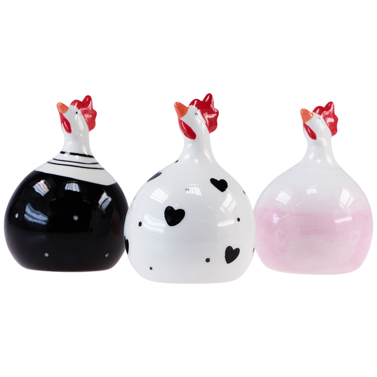 A húsvéti figurák három különböző változatban készülnek. Mindegyik csirke szobor fekete hasú, fehér pöttymintás és hozzáillő gyűrűkkel a nyak körül, rózsaszín hasú fehér szívecskékkel és rózsaszín gyűrűkkel, valamint fehér színben, nagy szívecskékkel és kis pöttyökkel a dekoratív készletben. a húsvéti adatok tartalmazzák.