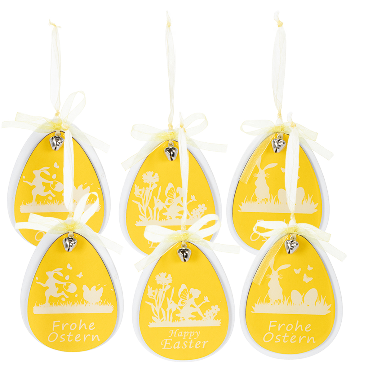 Kapsz 6 db sárga-fehér fa dekortojást akasztani. A nagyobb tojás magassága körülbelül 11 centiméter, szélessége pedig körülbelül 8 centiméter. A körülbelül 9,5 × 7 centiméteres sárga tojás túléli a fehéret. Az átlátszó sárga selyemszalaggal együtt a fa díszítés a felfüggesztéssel együtt körülbelül 19 centiméter hosszú.