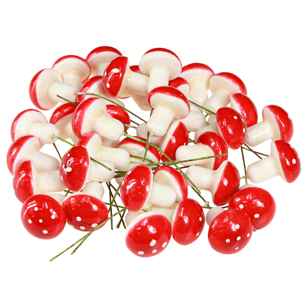 A légyölő galócából 36-ot kapsz dróton. Mindegyik gomba körülbelül 2,5 centiméter átmérőjű, és huzallal együtt körülbelül 9 centiméter teljes hossza. A díszgombákat rugalmas hajlító drótjukkal fényfüzérre is csodálatosan rögzíthetjük, ha a drótot köré tekerjük.