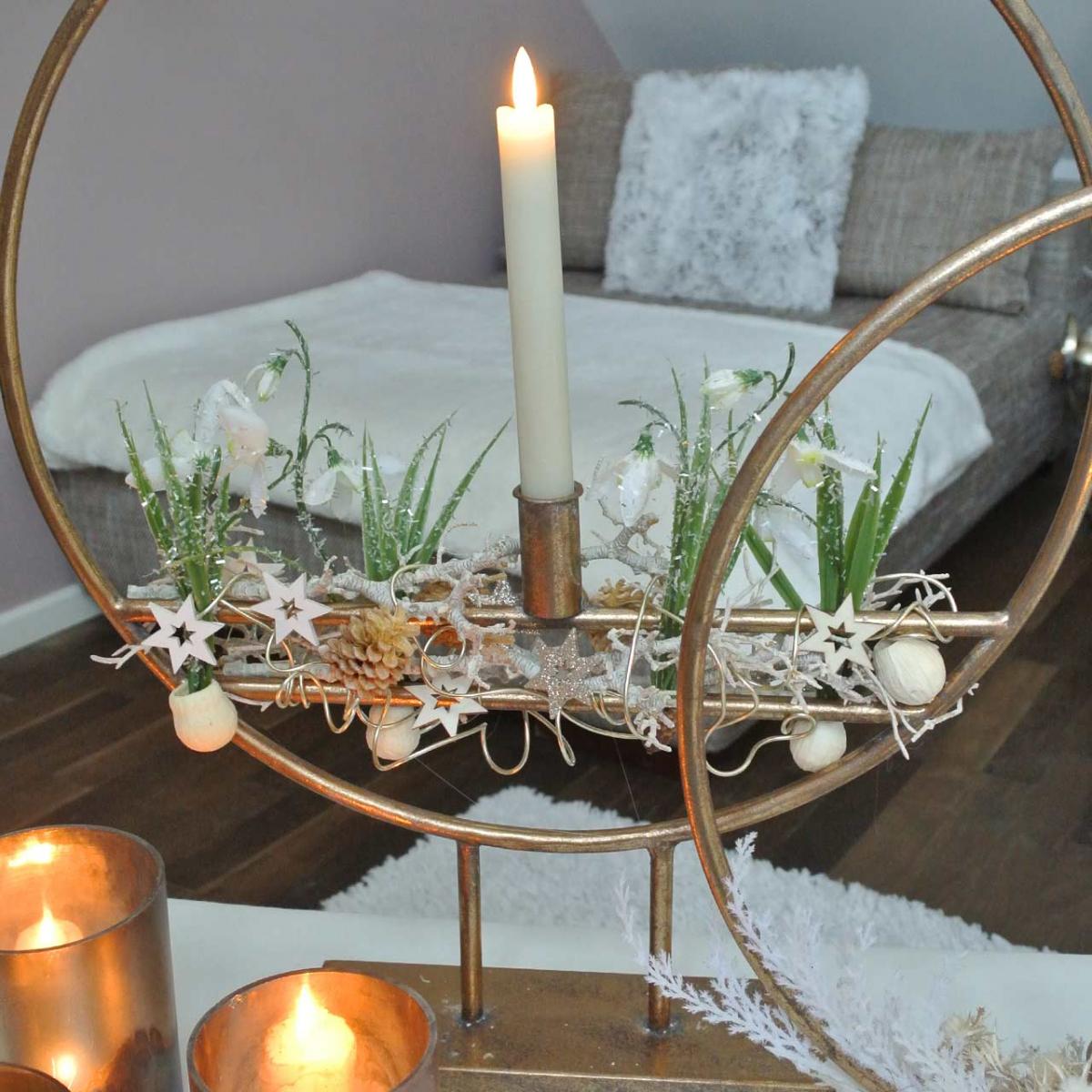 Tekerj körbe egy lámpaláncot, vagy díszítsd a fém gyertyatartót fenyőzöld vagy szárított virágokkal. Mert a kúpos gyertyatartó nem csak adventi díszgyűrűként szép - esküvői dekorációként vagy elegáns asztaldíszként egy évfordulóra vagy a hétköznapokban is csodálatosan használhatod az aranyszínű gyertyadekorációt!