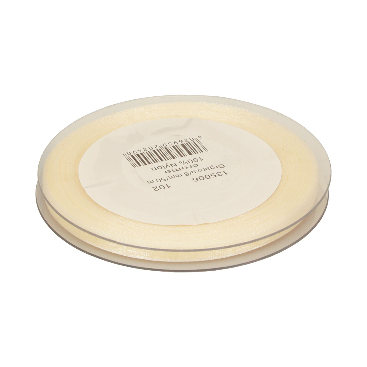 Ha krémszínű organza szalagot vásárol, akkor a körülbelül 6 milliméter széles és körülbelül 50 méter teljes hosszúságú szalagot egy erős műanyag orsóra tekerve kapja meg.