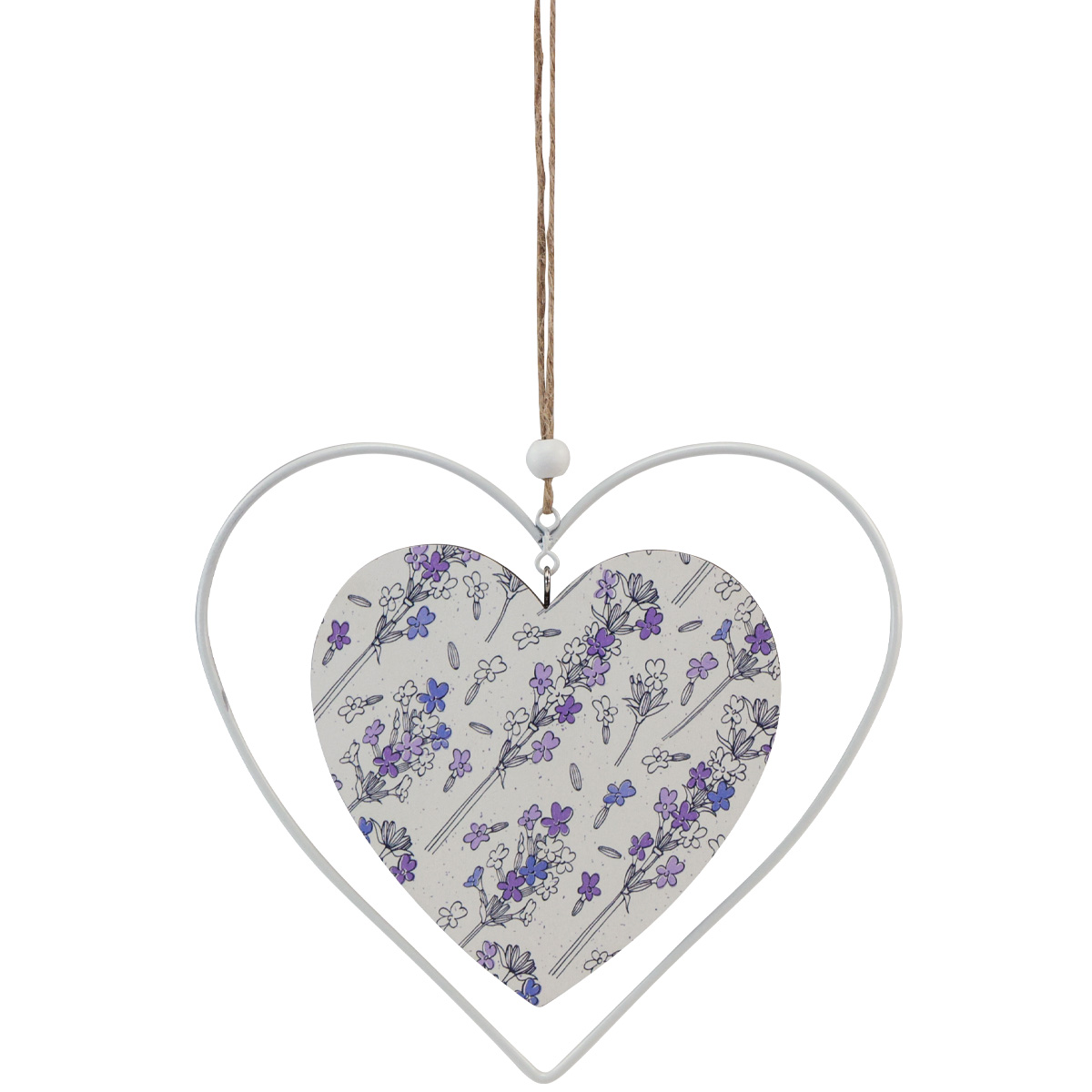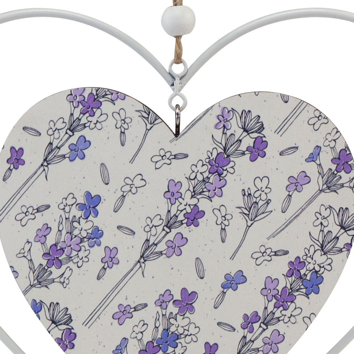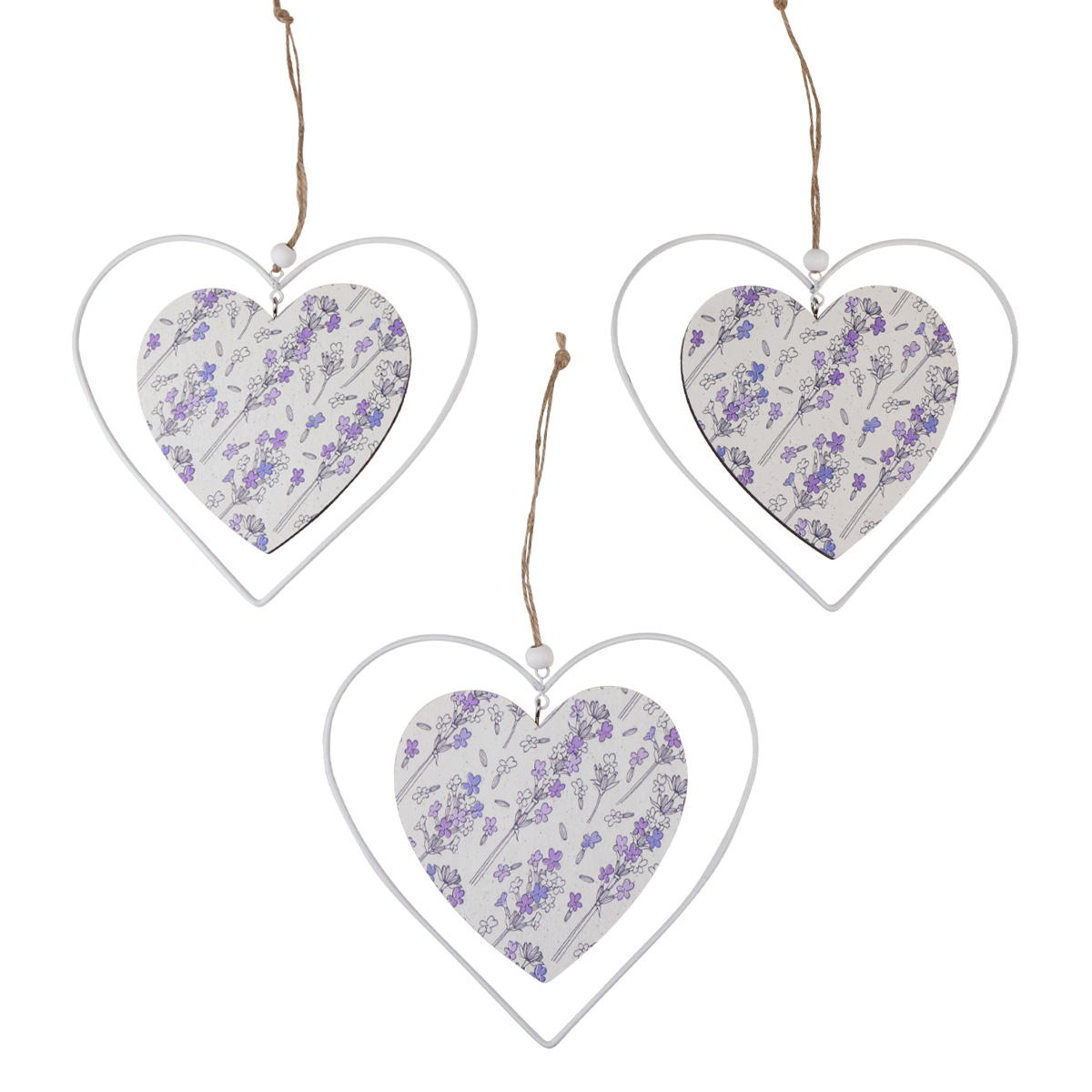 A szívek fehér fémkeretében egy kisebb fa szív lóg. A felakasztható fehér díszszívek modern virágmintával és különböző lila árnyalatú csokrokkal díszítettek. A hátlap kezeletlen, világos fából készült. Ha szeretnéd, akár saját dekorációt is készíthetsz a fából készült szívecskékkel festéssel, felületre ragasztással vagy akár feliratozással is.