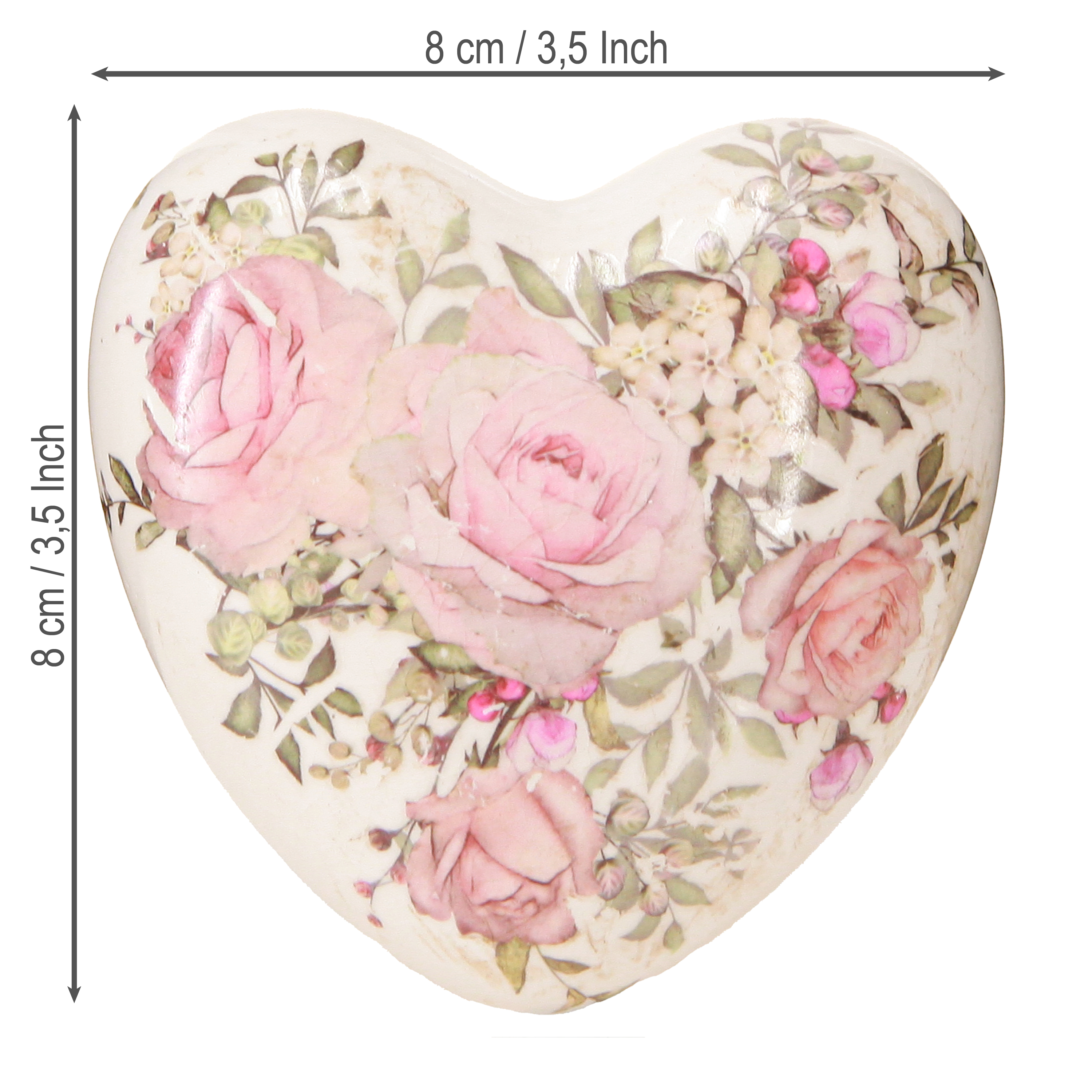Tapasztalja meg három dekoratív szívünk elbűvölő szépségét, amelyek lágy krémes és rózsaszínben romantikus rózsa motívumot tartalmaznak. A kerámia dekoratív szívek recsegő hatásuknak köszönhetően különösen elbűvölőek, és csodálatosan illeszkednek a vintage vagy vidéki ház stílusába. Mindegyik szív körülbelül 8x8 cm-es, és átlátszó fényes bevonattal van ellátva, amely kiemeli a finom rózsa részleteket. Az alja három védővel van felszerelve, amelyek megvédik bútorait a karcolásoktól. Ezek a dekoratív szívek nem csak varázslatos kiegészítői otthonának, hanem csodálatos ajándékok is a szerelmesek számára vagy egy esküvőre. Helyezze a kerámia szívecskéket az asztalára rugós asztaldíszként, vagy használja nappalija fénypontjaként. Akár tavasszal, akár nyáron, ez az üvegezett szívdísz mindig romantikus hangsúlyt kölcsönöz otthonának.