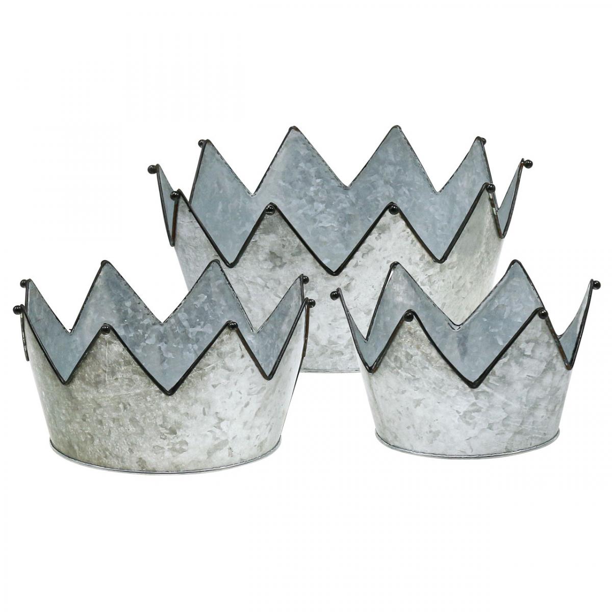 A három cinkből készült fémtál különböző méretben készül. Közös bennük a fekete szegély a tüskék körül, amelyeket egy kis díszgömb díszít. A labda is fekete, hogy passzoljon a vintage dekorációhoz. A fekete szegély díszítéssel mindenki számára világossá teszi: Három korona van itt - tölthető vagy egyszerűen elhelyezhető.
