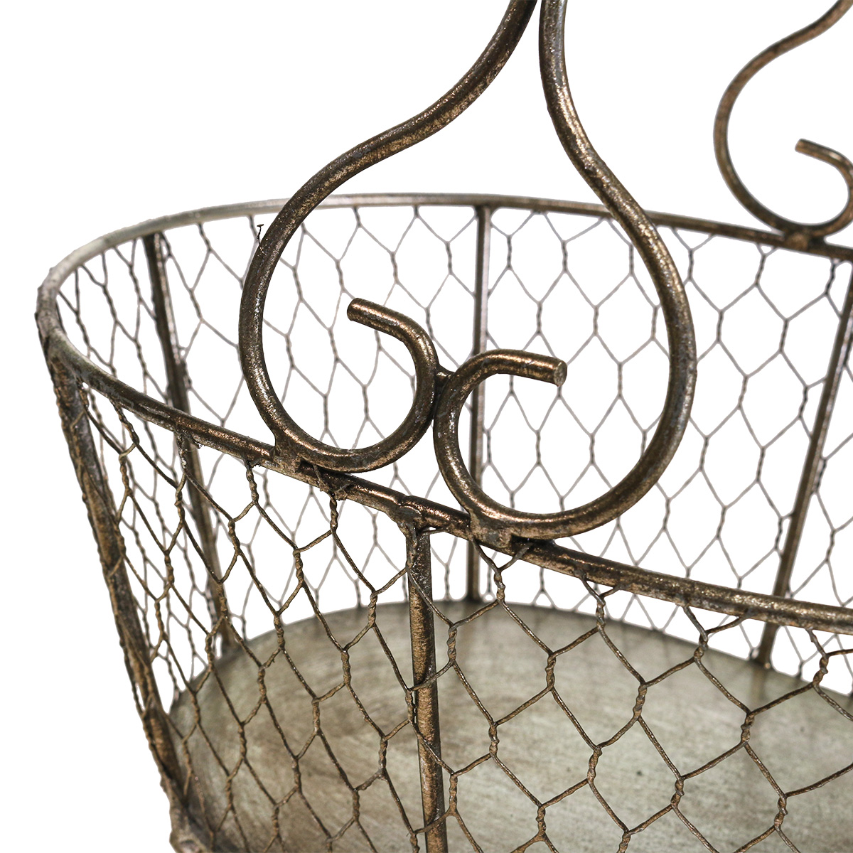 Ennél a drótkosárnál elegánsabb antik megjelenést nem találsz virágkompozíciódhoz: az ívelt formák, valamint a pezsgő és szürke bevonat egyedi karaktert ad a fogantyús kosárnak.Az ovális drótkosár kissé kiszélesedik a teteje felé, és a rombusz alakú hálónak köszönhetően nagyon légiesnek tűnik. A fémkosáron lévő nemes ezüst tónusú pezsgőnek az öregedés mesterséges szürke jelei adnak mélységet. A díszkosár biztonságosan áll négy gömblábon, de a díszfogantyúra is felakasztható.