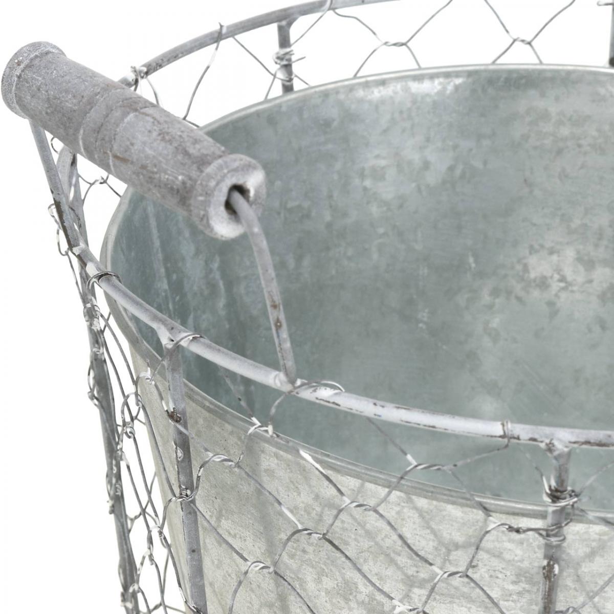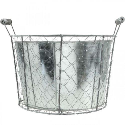 Drótkosár fém tállal, növénycserép, tavaszi dekoráció ezüst, mosott fehér, kopott sikkes Ø30cm H25,5cm