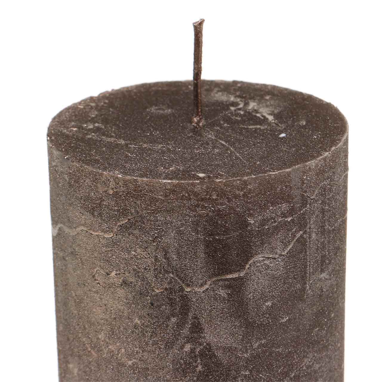 A rézmetál színben pompázó egyszínű oszlopgyertyák misztikusak: barna alapon titokzatos rézszínű minta ragyog és csillog a gyertyafényben.