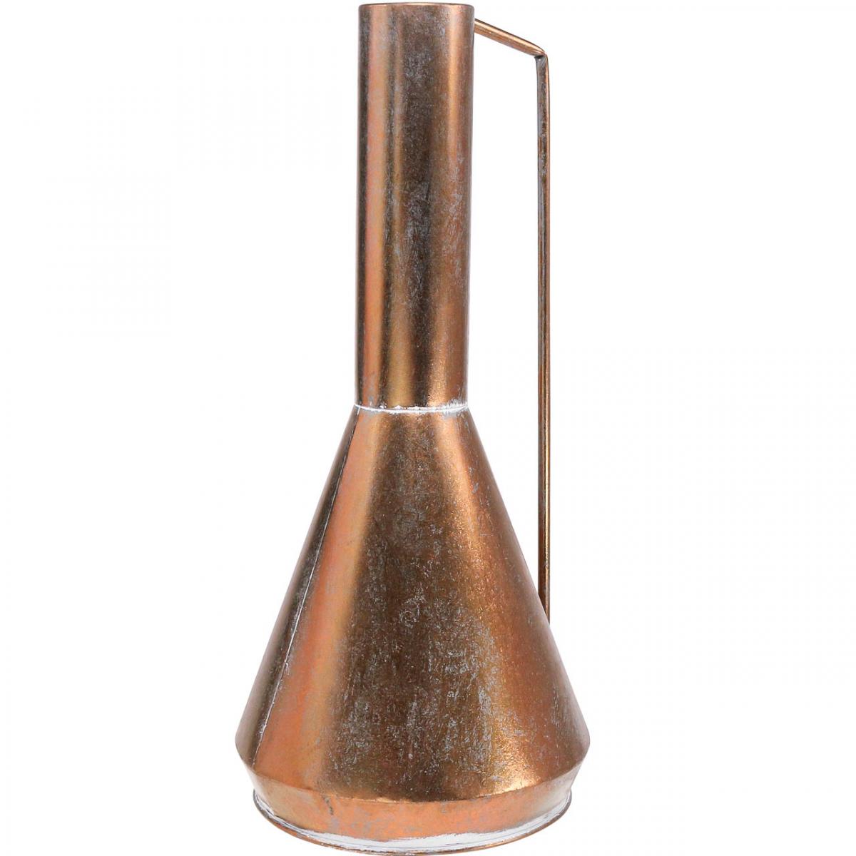 A nyak keskeny. A has terjedelmes, és kissé elkeskenyedik az alja felé. Tehát a lábnyom keskenyebb, mint a has. A dekoratív váza tölcsér alakú. Kialakításában és négyzet alakú fogantyújával a dekokancsó a keleti edényekre emlékeztet. A réz szín kiemeli az egzotikus vintage bájt.