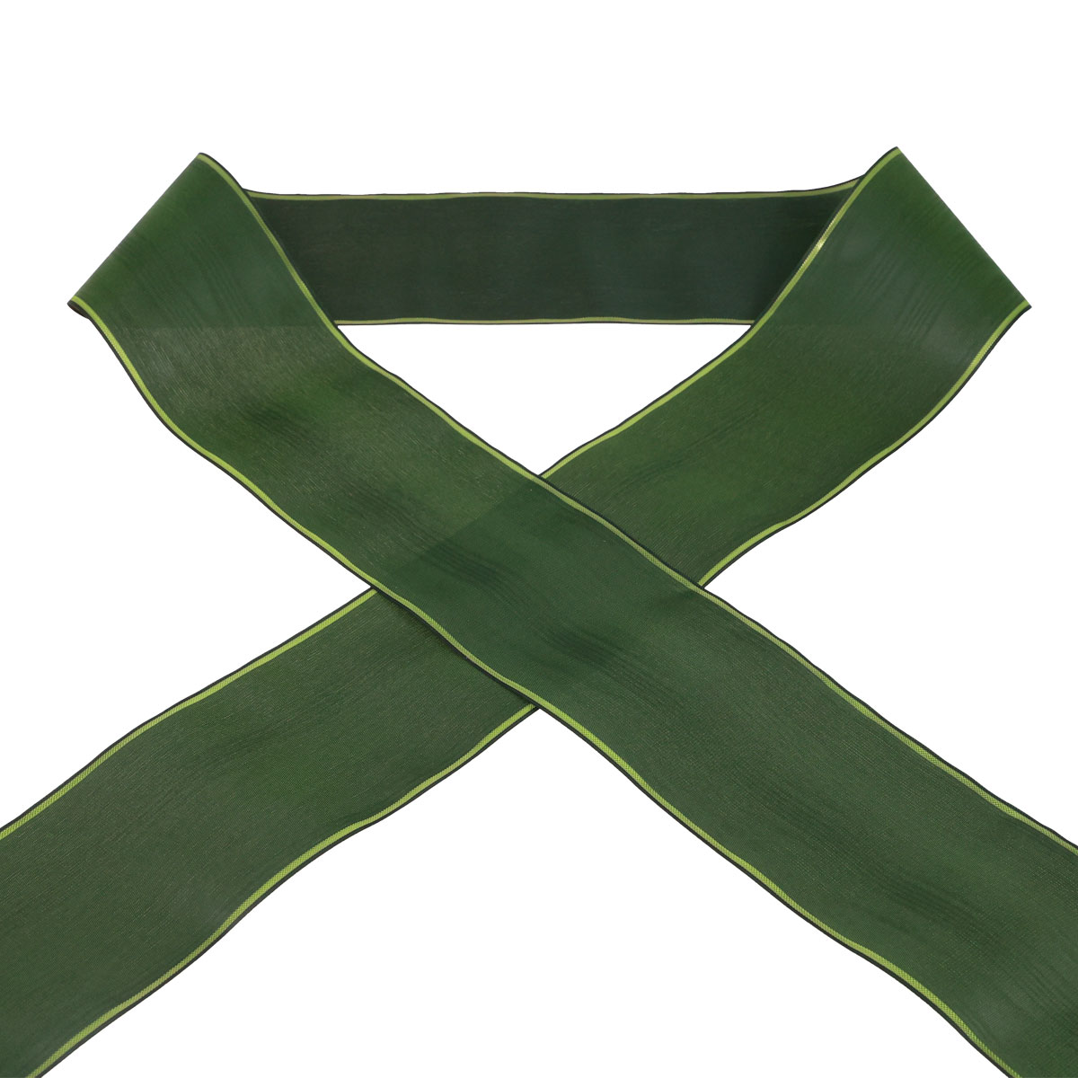 A koszorúszalag „Made in Germany”, és lenyűgöz sima textúrájával és irizáló moaré felületével. A világoszöld és arany színű élek méltóságteljes és ünnepi megjelenést kölcsönöznek a dekoratív szalagnak.