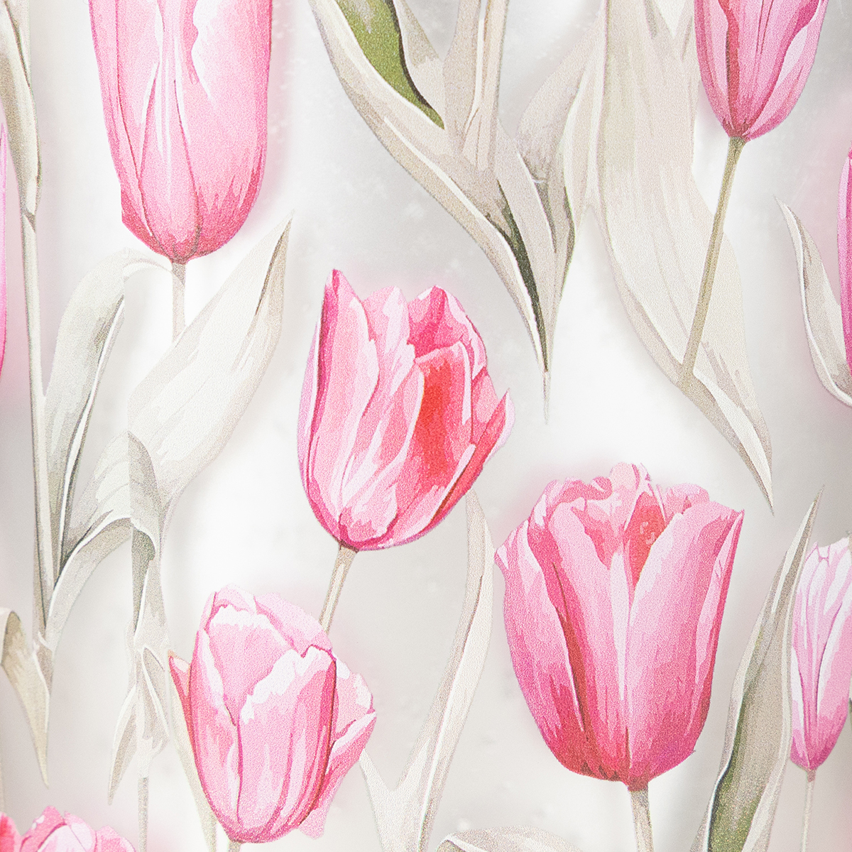 - Színek: Rózsaszín és fehér tulipán motívummal