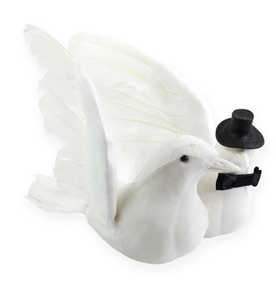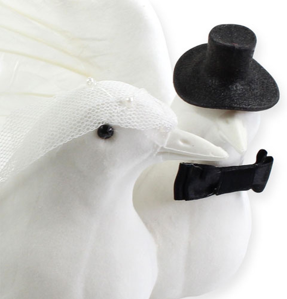 A díszgalambok, mint pár, pelyhesített műanyagból készülnek. A vőlegény fekete cilindert és selyemszalagból készült fekete csokornyakkendőt visel; a menyasszonynak selyemszövetből készült fátyla van, amely 3 műanyag gyöngyökkel van a fejre rögzítve. A szárnyak és a farok valódi madártollból és egy kis csillámmal meghintett pehelyből készültek. Puha vatta tartja össze a tollakat.