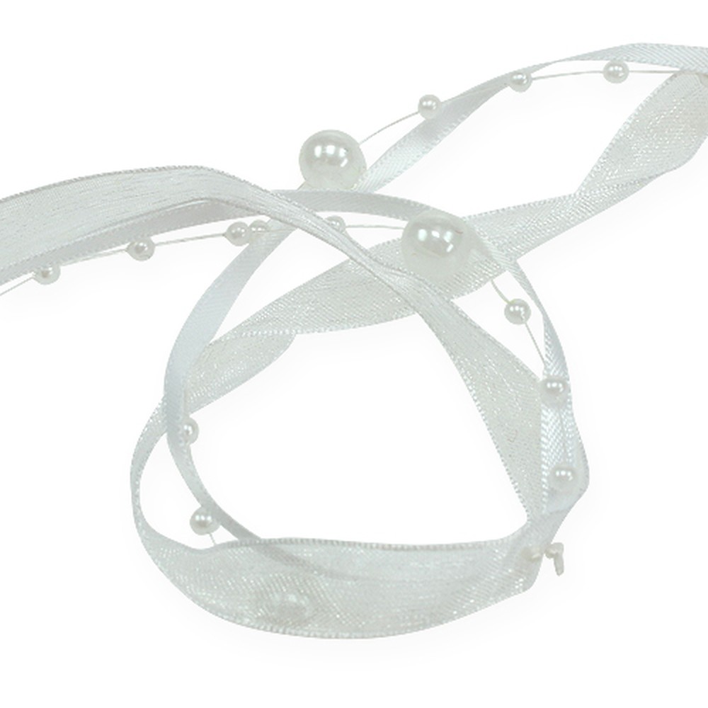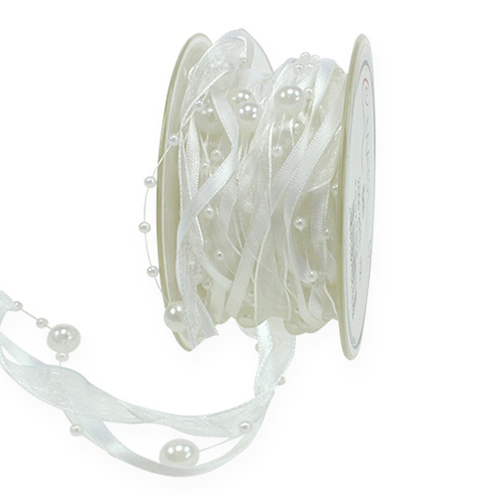 A fehér esküvői szalag körülbelül 5 méter hosszú, és egy műanyag tekercsre van feltekerve. A szélesség körülbelül 20 milliméter, a gyöngyök átmérője pedig körülbelül 0,2-0,8 centiméter.