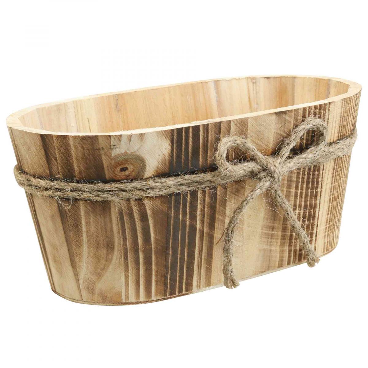 A vidéki ház stílusát és a fahéj természetességét a dupla juta zsinór is kiemeli, a fába ágyazott gyönyörű masnival. A faedény belseje teljesen kezeletlen. Ha a tálat kibéleli fóliával, akkor is szolgálhat cserepként vagy ovális virágtartóként az élő virágok számára.