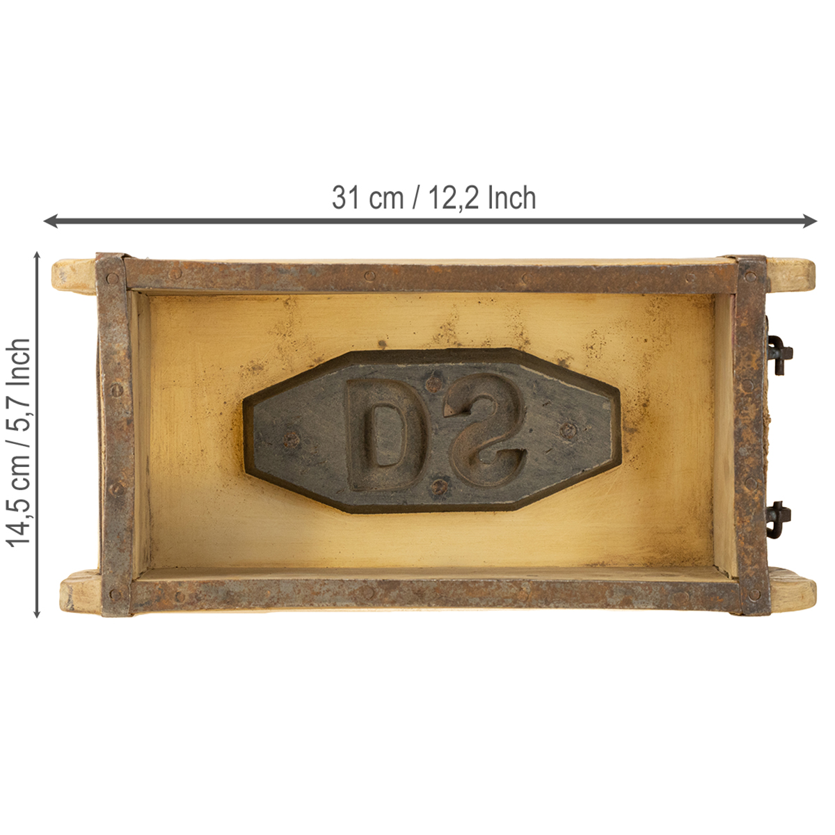 Az oxidált fém enyhén rozsdásodva tovább hangsúlyozza a kis fadoboz vintage varázsát. Az újonnan kezelt és felfrissített régi téglaforma mára remek fa- és fémdísz, új céllal.