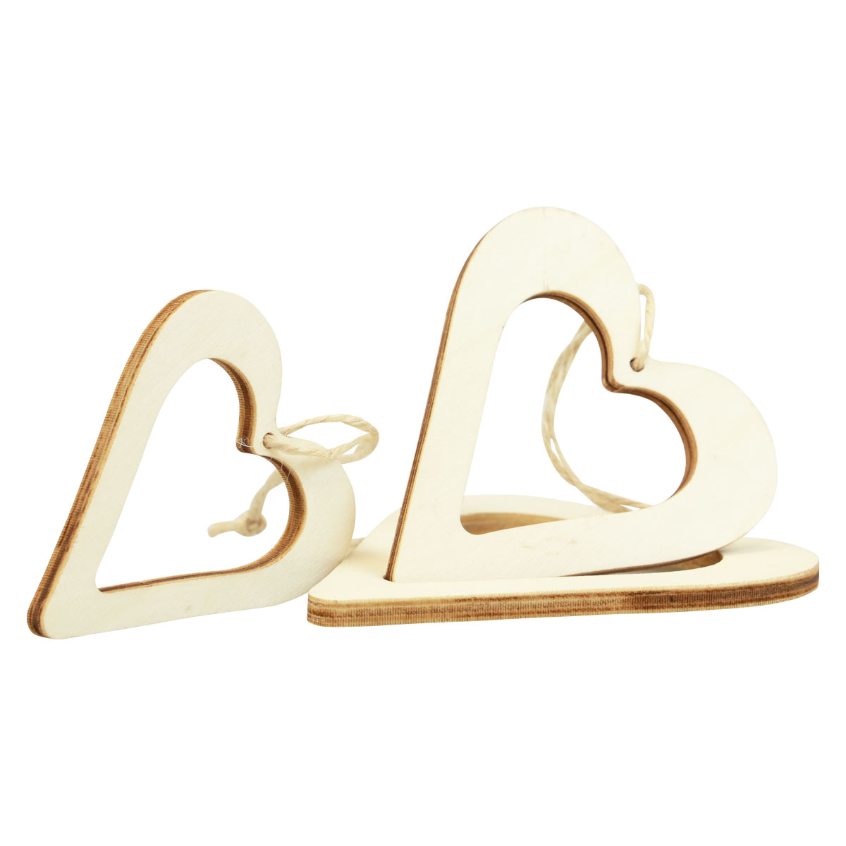 A szívek minőségi, világos fával furnérozottak és megőrzik természetes színüket, oldaluk rusztikus lánggal rendelkezik. Ez minden szívhez rusztikus bájt kölcsönöz. A természetes szálból készült fehérített zsinór teljes mértékben megfelel ennek a függő dekorációnak a barátságos megjelenésének.