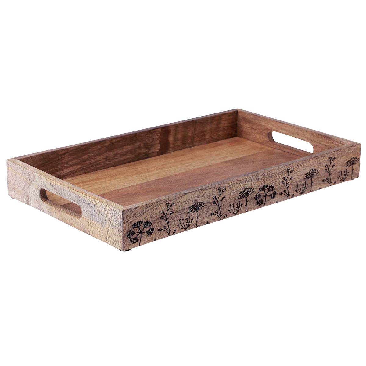 A téglalap alakú tálca egyszerű kialakítását a valódi mangófán égetett rét motívum finomítja.