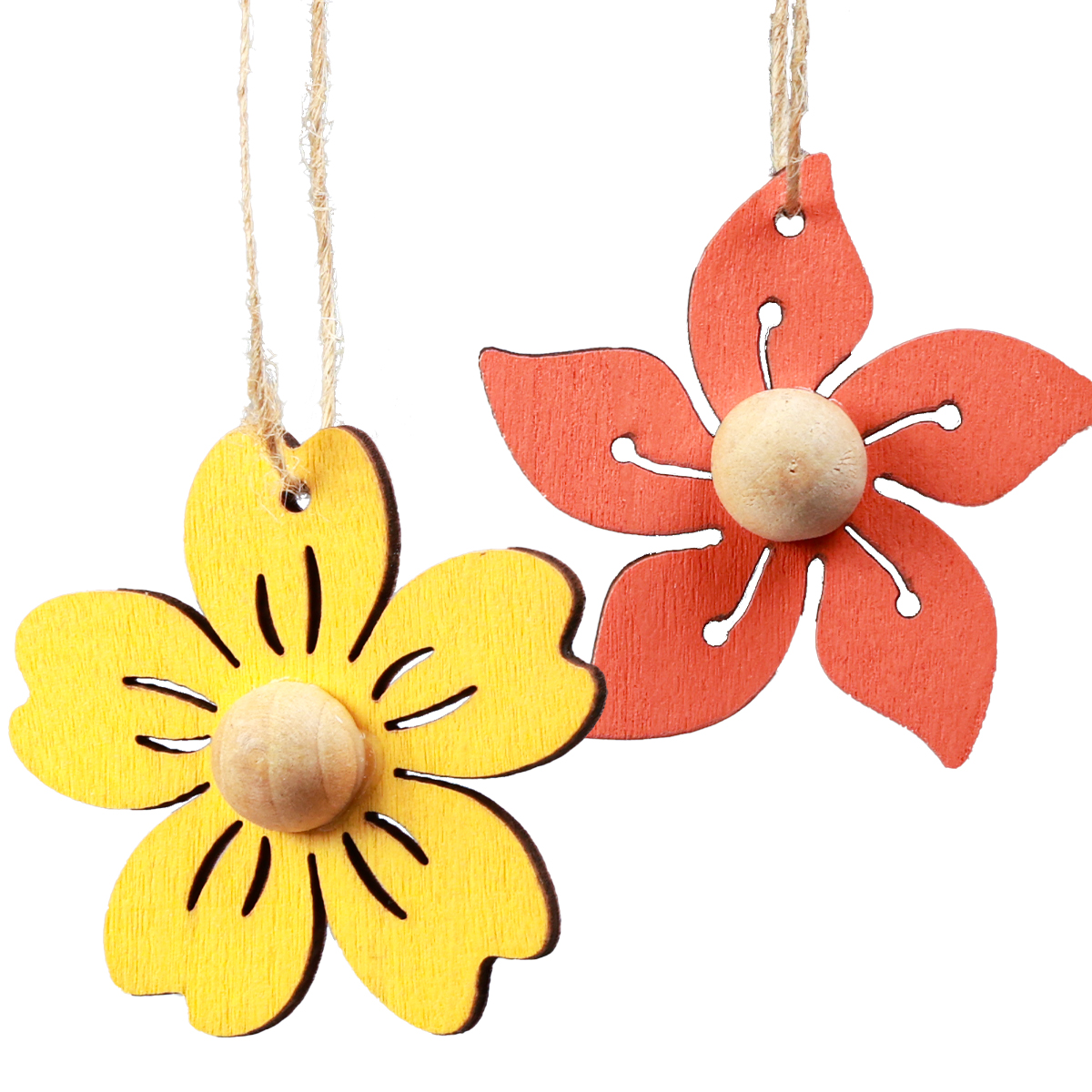 A juta címkéket külön mellékeljük. A fából készült virágokat egy másik szalagra is felakaszthatod, több virágot összefűzhetsz füzérként, vagy akár asztali díszként és elrendezésben is felhasználhatod őket.
