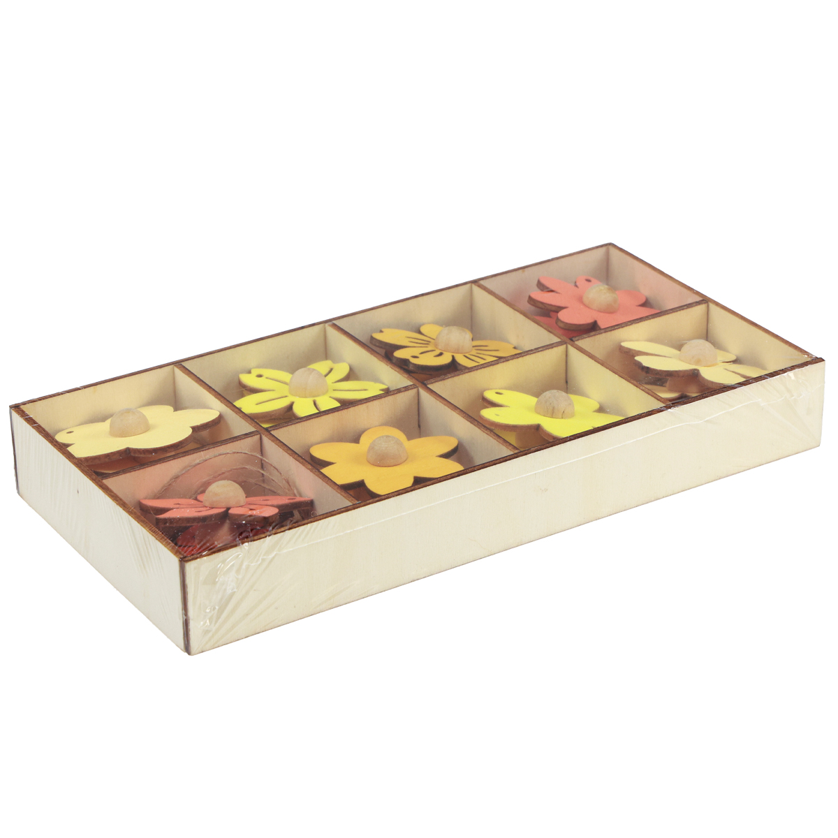 Egy gyönyörű fadobozban összesen 24 db favirágot kap a sárga és a narancs különböző árnyalataiban. Mindegyik favirágból hármat kapsz.