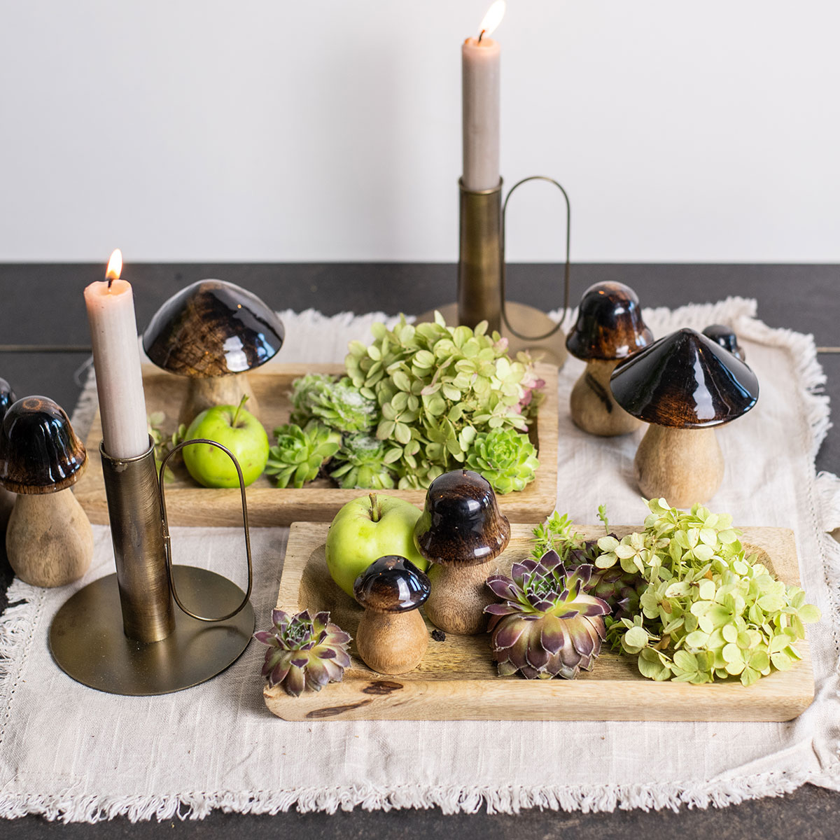 Ez a fából készült gomba különleges fényével gyönyörködik. Tedd a hangulatos gombadíszítést egy tálba mohával az elbűvölő őszért!A festék helyenként mélybarna, helyenként tiszta. Így a fény beesésétől függően a fagomba természetes erezete is magához tér. A mázhatás fényessé varázsolja a dekoratív gombán lévő festéket. Ezen kívül van még a kezeletlen nyél, ami szintén tömör mangófából készült.