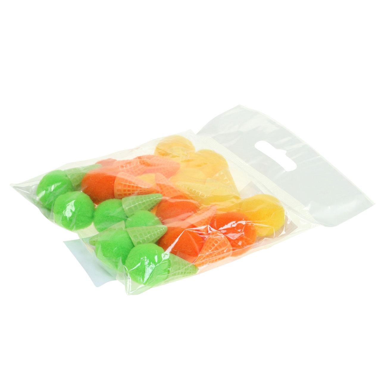 A gofriban lévő műfagyit háromszor válogatva, összesen 18 db-os kiszerelésben kapod zöld, sárga és narancs színben, színenként 6 db-ot. Minden jéggolyóval ellátott gofri körülbelül 3,5 centiméter méretű.