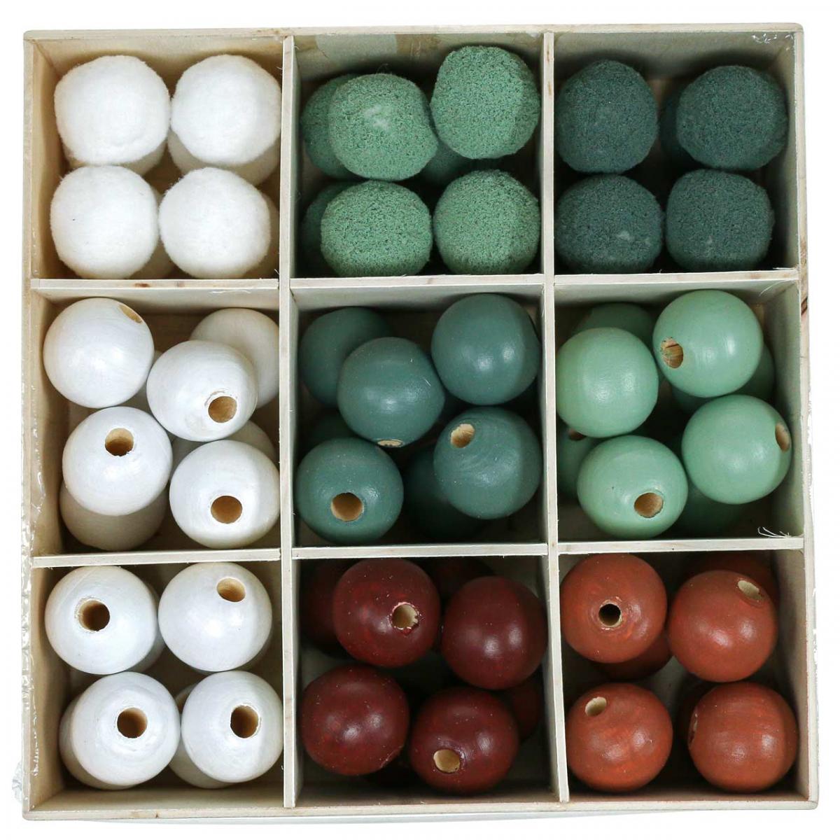 A lyukas fagolyók sötétzöld, világoszöld, sötétbarna, világosbarna és fehér színben kaphatók. Nyolc tömör műanyagból készült lyuk nélküli zöldes dekorgolyó is található, amelyek a felületi szerkezetből mohagolyónak tűnnek. Az utolsó négy lyuk nélküli díszgolyó fehér és puha, akár egy kis hógolyó. A fagyöngyök és díszgolyók színei és textúrája ideálisak az őszi és karácsonyi dekorációk készítéséhez.
