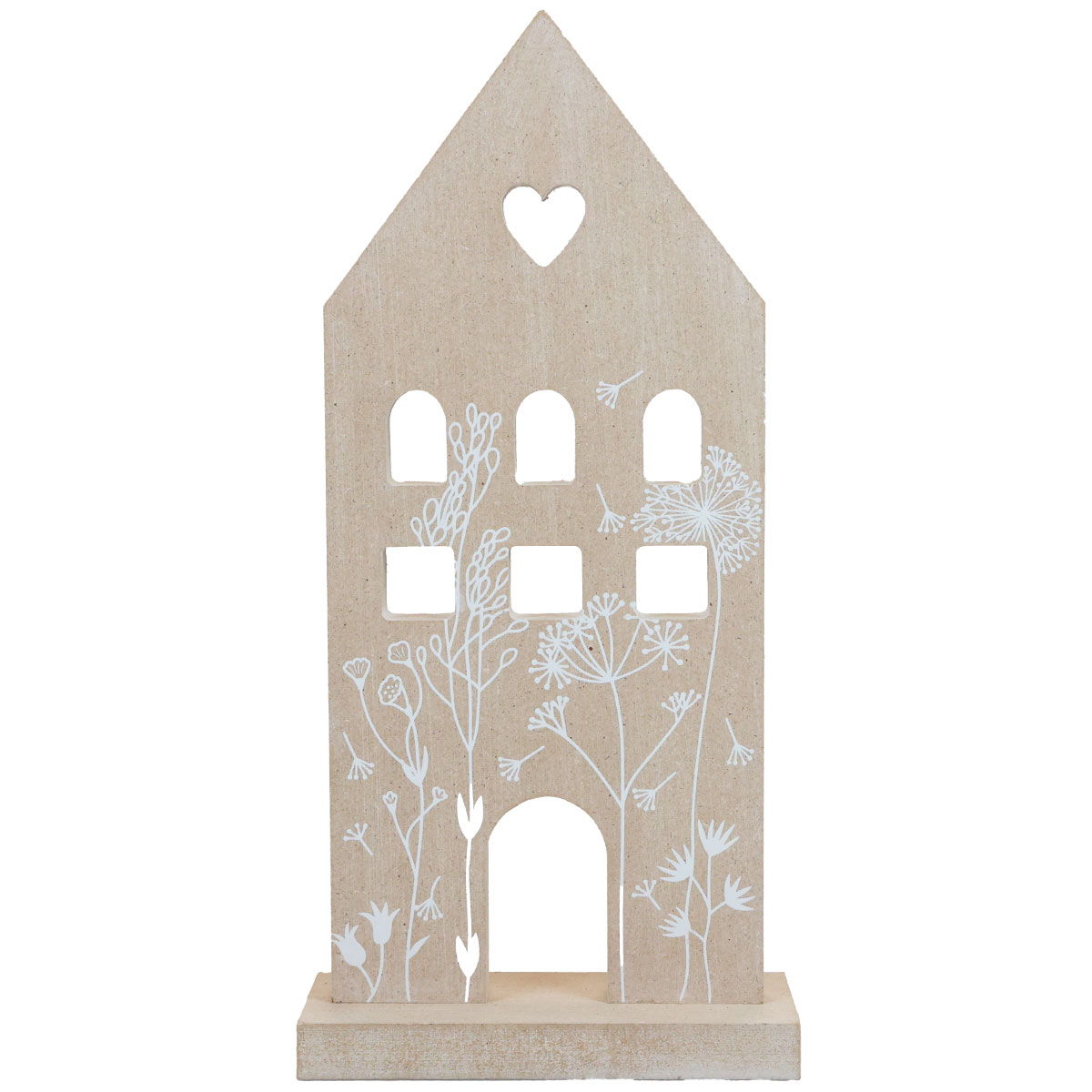 Az MDF fából készült keskeny díszház lapos, szélesebb alappal rendelkezik, ami azt jelenti, hogy az állvány stabilan és biztonságosan áll az asztalon vagy az ablakpárkányon.