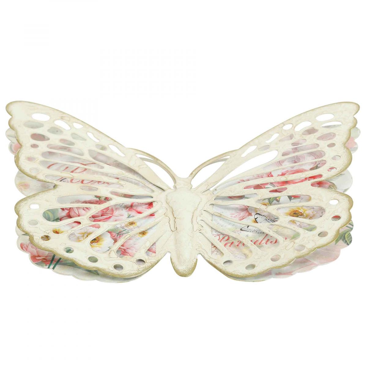 A fali dekorációs pillangó háromdimenziós kialakítású, így a krémfehér szárnyak filigrán stancolt részletekkel enyhén kiemelkednek a helyiségből. A fémdekoráció mélyedései rózsaszirom vintage stílusú virágmintát mutatnak rózsaszín és sárga színben. A kis pillangók ábrázolása és a betűk tovább teszik teljessé a fém pillangó kedves rózsa motívumát. A kiálló pillangószárnyak szélén található finom arany szín ünnepi hangulatot kölcsönöz az egésznek.