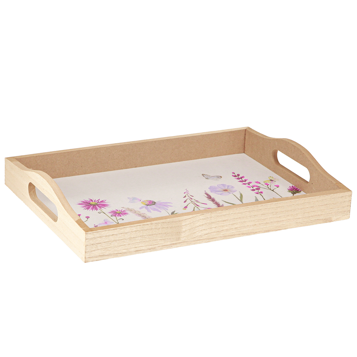 Négyszögletes fatálca natúr színben virágokkal és pillangóval – sokoldalú dekorációs elem vidéki stílusban