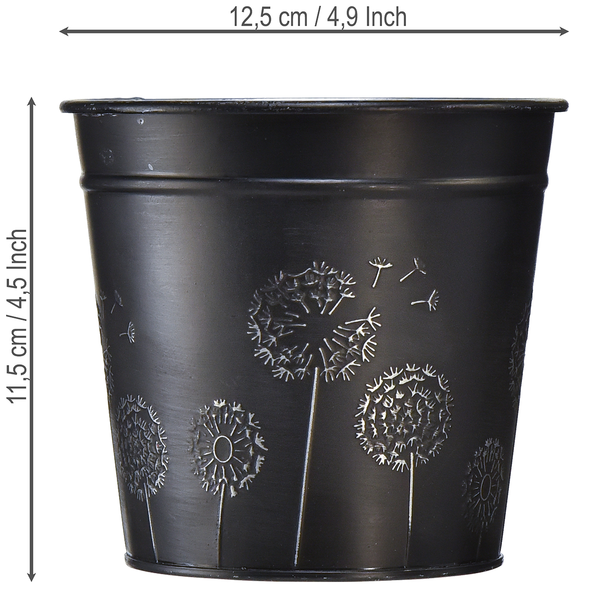 Ez a fekete virágcserép ezüst színű díszítéssel rendelkezik, amely nyári érzést kelt. A pitypang különböző méretű és állapotú. Néhány esernyő pedig máris új célpontok felé repül.