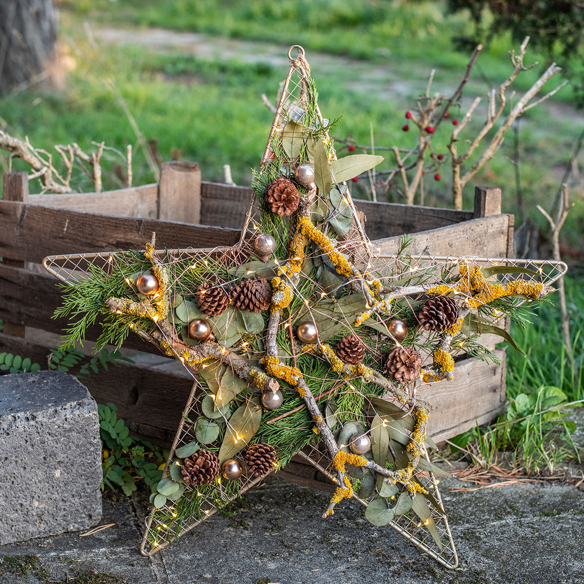 Tervezze meg saját dekorációs csillagát ezzel a szőnyeggel! Sokféle dekorációs ötletet megvalósíthat a rácson. A hálós fémcsillag segítségével mesterséges függőleges kertet hozzon létre a csillag tetején. Húzzon szalagokat a rács köré, és adjon színesebbé a dekorációs csillagot.